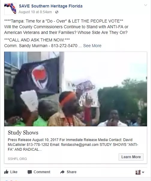 Save Southern Heritage writes online that the group trawled publicly available databases to amass information about the activists. “Research sources for the Study included social media sites, voter registration rolls, speaker sign in cards, property appraiser records, and other internet research sites,” Save Southern Heritage’s August 10 post reads.