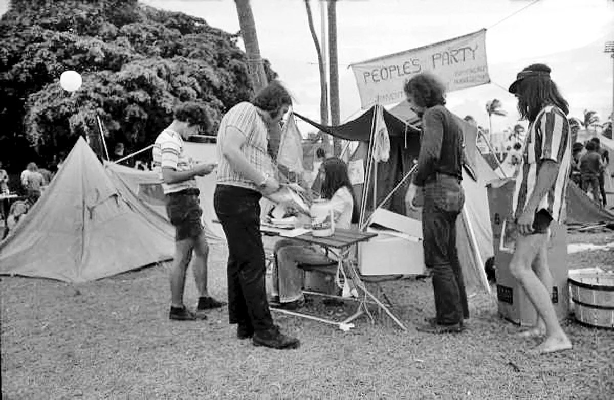 By the ’40s, full-on pot panic swept the nation, including its southernmost state. In February 1942, the front page of the Key West Citizen advertised screenings for the film Marijuana Madness with the description: “PARENTS!! See This Picture Now… Your Daughter May Be it’s Next Victim! Youthful Marijuana Victims… A Fate Worse Than Death! True! A Puff… A Party… A Tragedy…” The People’s Pot Party brought radical weed politics to Flamingo Park during the 1972 GOP convention. Photo via State Archives of Florida / FloridaMemory.com