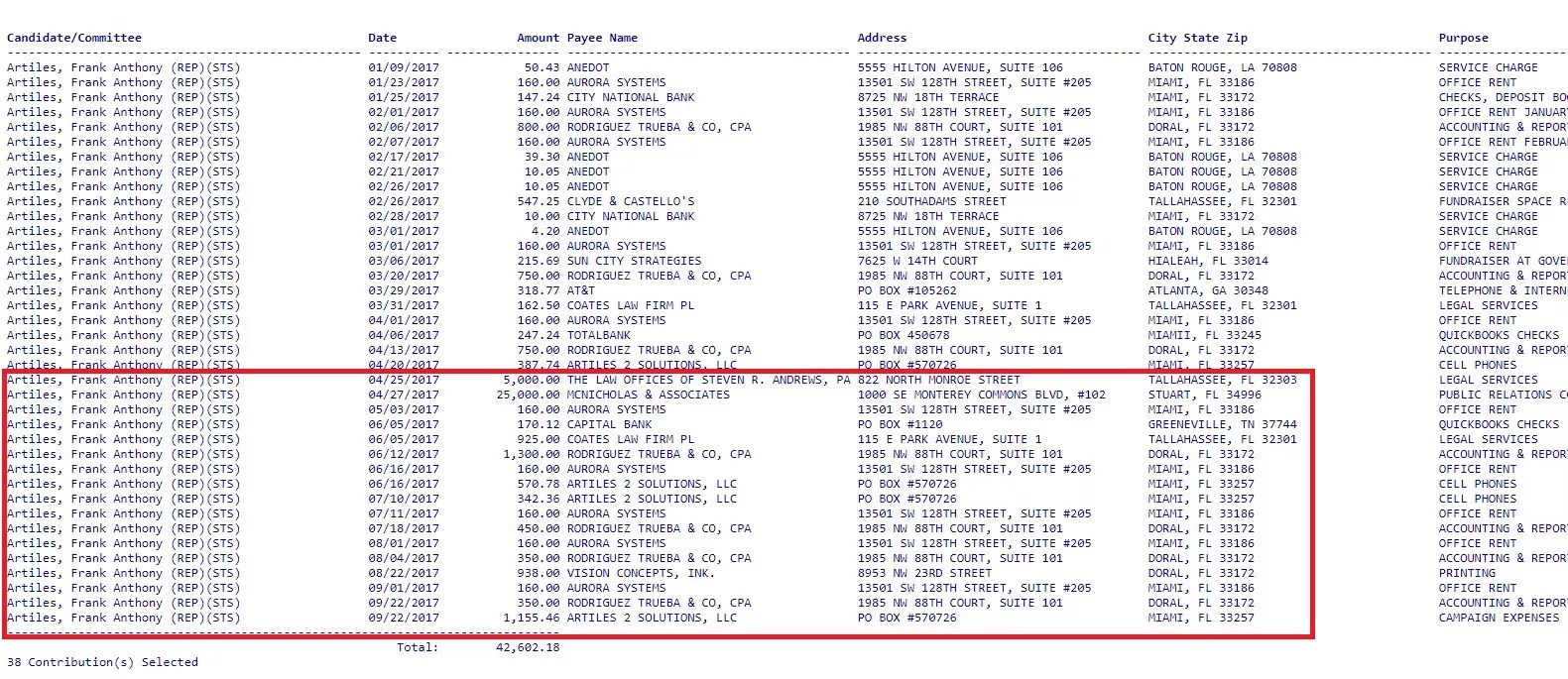 And the other question is whether the payments can be explained as “legitimate campaign expenses” — the legal hurdle Artiles must clear to prove he wasn’t spending leftover campaign cash on himself. State records show he has not received any new campaign contributions since