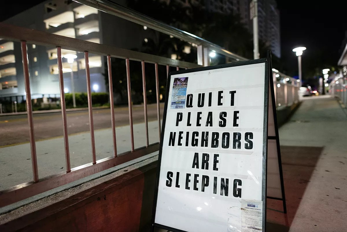 The bay off South Beach’s Sunset Harbour glitters with the reflection of city lights. Onshore, Purdy Avenue is empty save for a few glossy cars with quiet, expensive motors and the occasional scurrying cockroach. It’s midnight on a Friday, and the only people around are the three security guards stationed outside Purdy Lounge. Arms crossed, they stand next to a black-and-white sign posted out front that implores, “Quiet Please, Neighbors Are Sleeping.”
