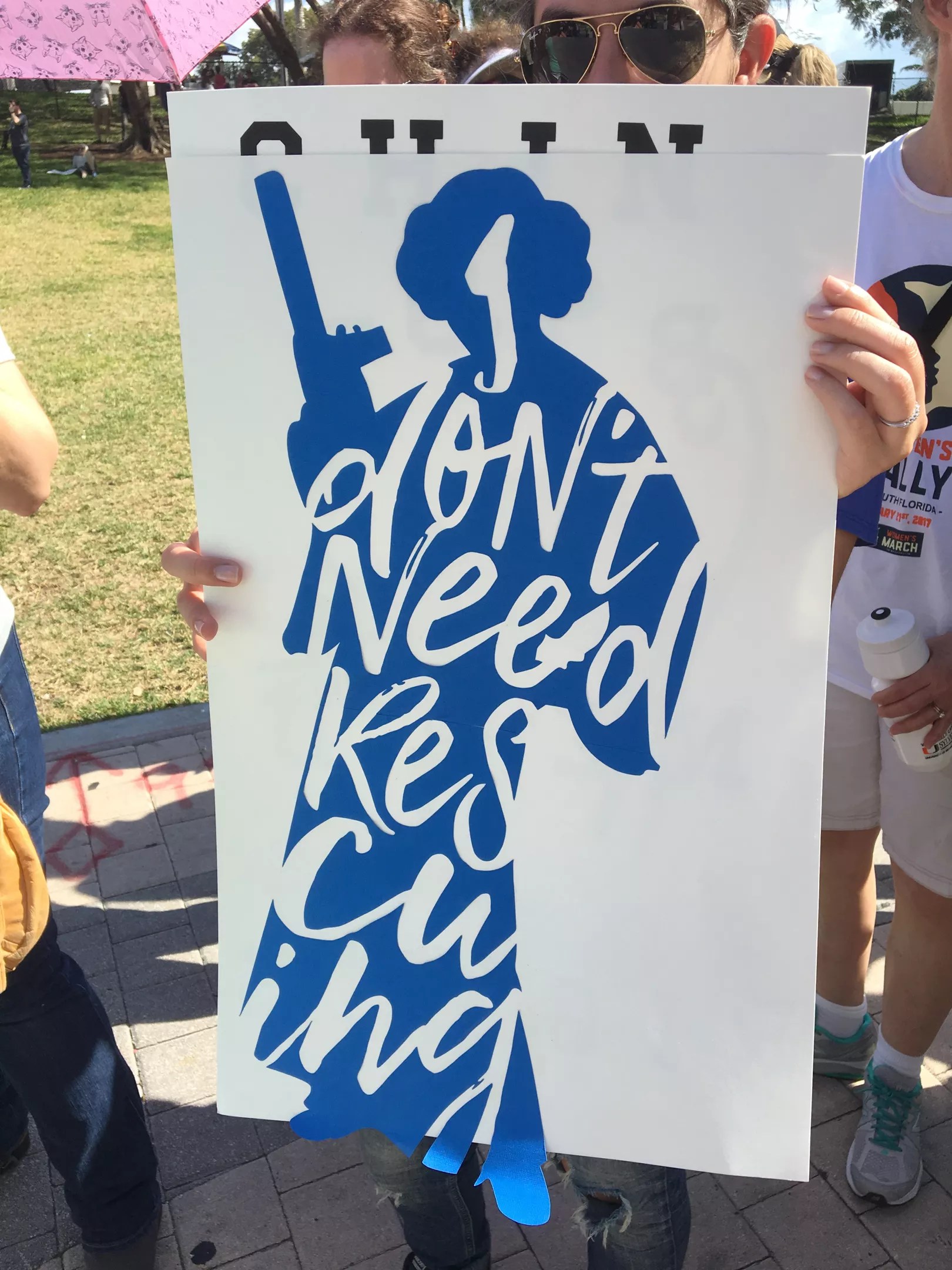 “I searched for the tiniest ones I could find,” the demonstrator said of the hands on the sign.