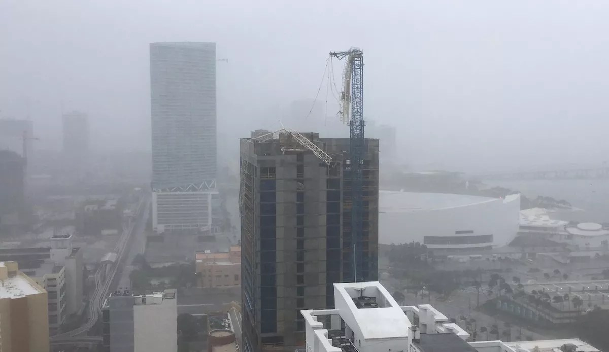 The rising winds – including a nearly 100 mph gust recently recorded at Miami International Airport – have now knocked over one of the dozens of huge construction cranes downtown, exactly as city officials warned might happen earlier this week. The crane is at NE 3rd Street, according to Local 10, and its huge counterweight is now slamming into the building.