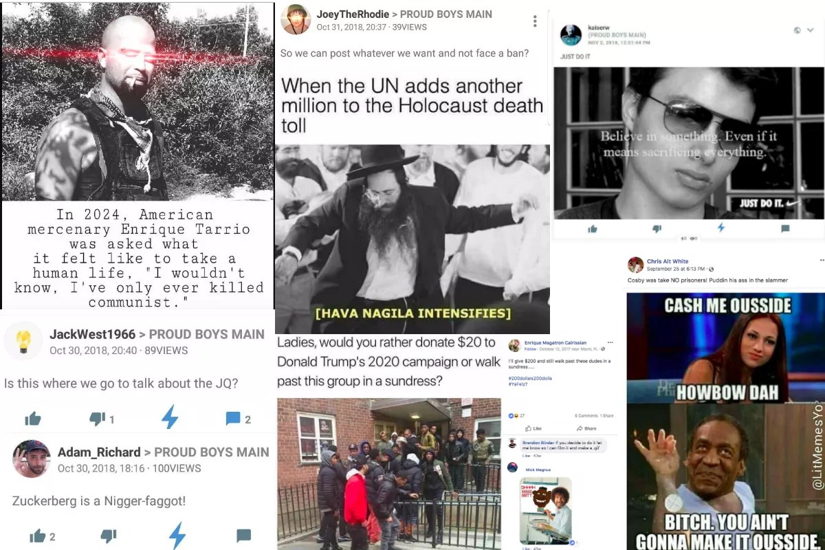 “Zuckerberg is a Nigger-faggot!” one Proud Boy named Adam Richard declared this past October 30. The next day, another group member, who goes by Joey the Rhodie, posted a photo of a Hasidic Jewish man dancing. It was captioned, “When the UN adds another million to the Holocaust death toll.” On November 2, KaiserW shared a photo of Elliot Rodger — a violent misogynist who killed six people and himself in Isla Vista, California, in 2014 — captioned, “Believe in something. Even if it means sacrificing everything.”