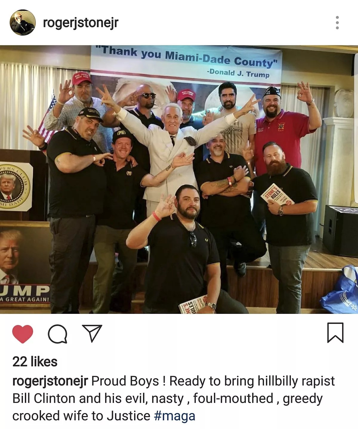 Roger Stone (center) poses with the Miami Proud Boys. See more of the Miami Proud Boys’ social media posts here.