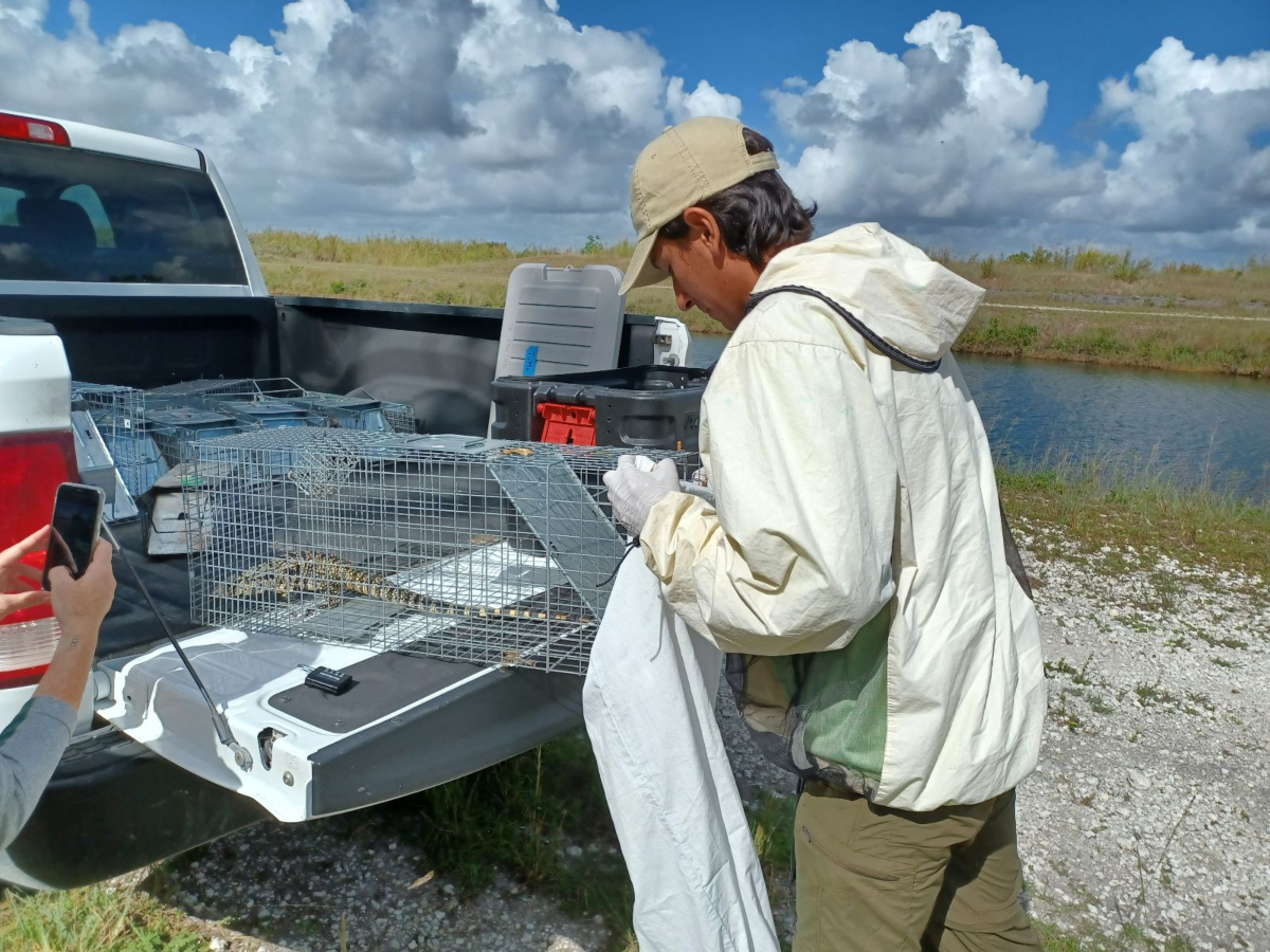 Along with two fellow interns, Mayo gets up every morning around 6 a.m. to check 314 tegu traps arrayed inside the park and beside canals managed by the South Florida Water Management District (SFWMD). The majority of the cage traps are placed outside the park to prevent more tegus from getting inside, and each one is armed with chicken eggs to entice the hungry lizards and a pressure plate to contain them until the researchers can pick them up.