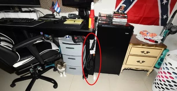 It was eventually revealed in court documents that Courson kept the beanie he wore that day, along with the baton that he used to strike the D.C. officer. Pictured in government evidence next to a stoic, white-pawed cat in Courson’s home, the weapon was found under his computer desk near a Confederate flag.