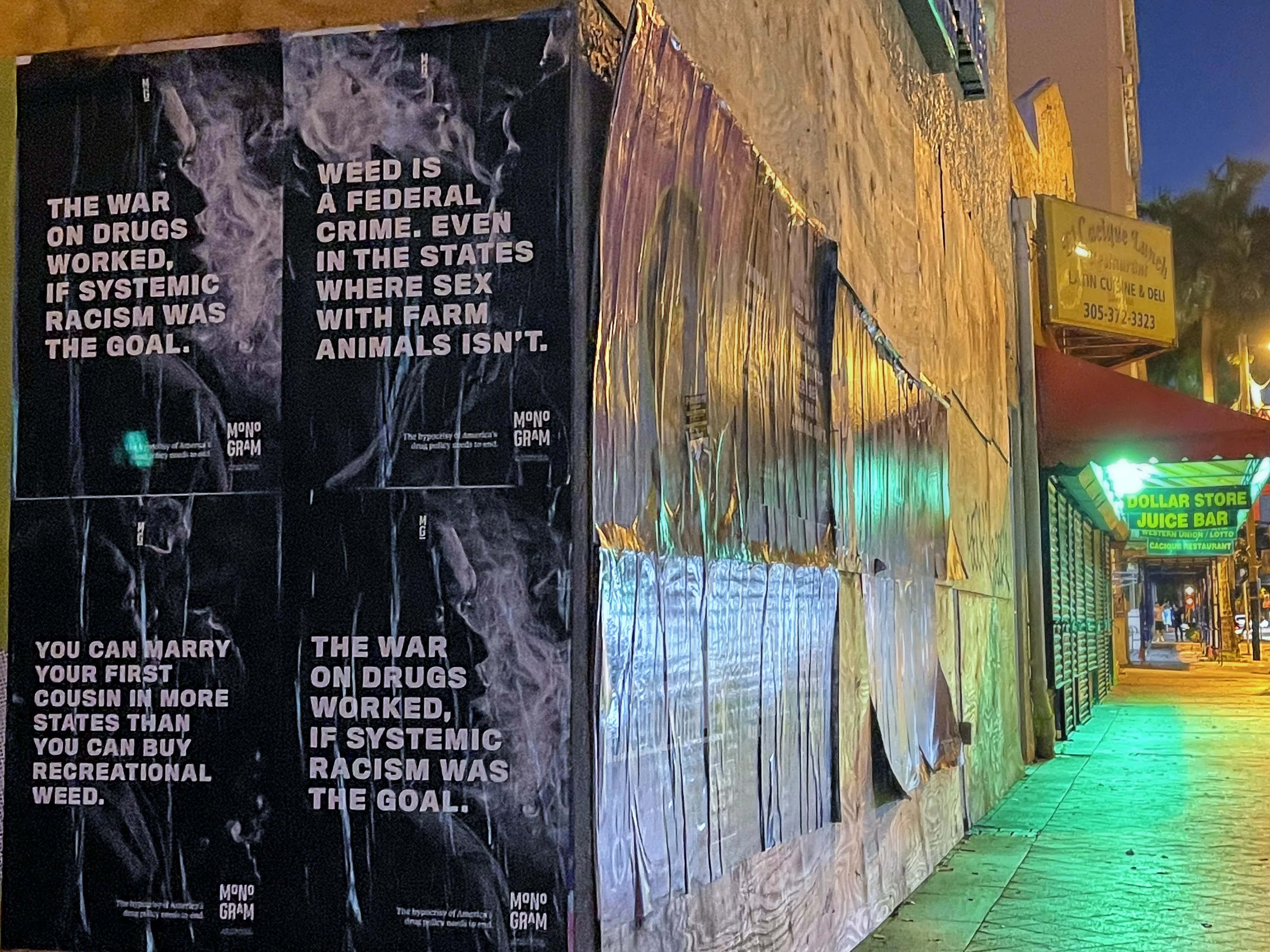 Having launched a cannabis brand called Monogram last year, the artist is now spreading his message with posters in Miami and across the U.S. The signs point out that prohibitionist cannabis laws are more widespread and harsh in some states than laws on bestiality and first-cousin marriage.