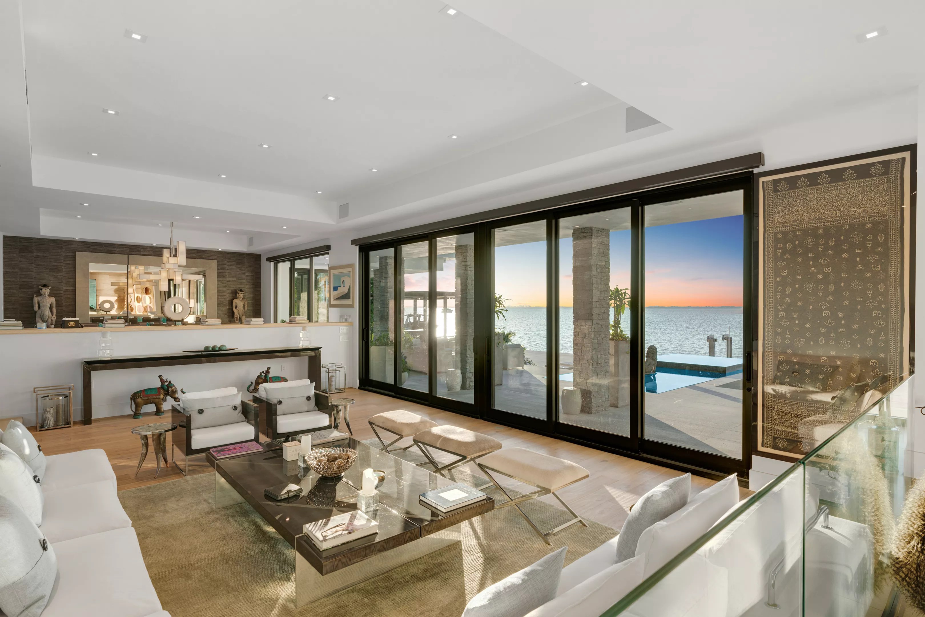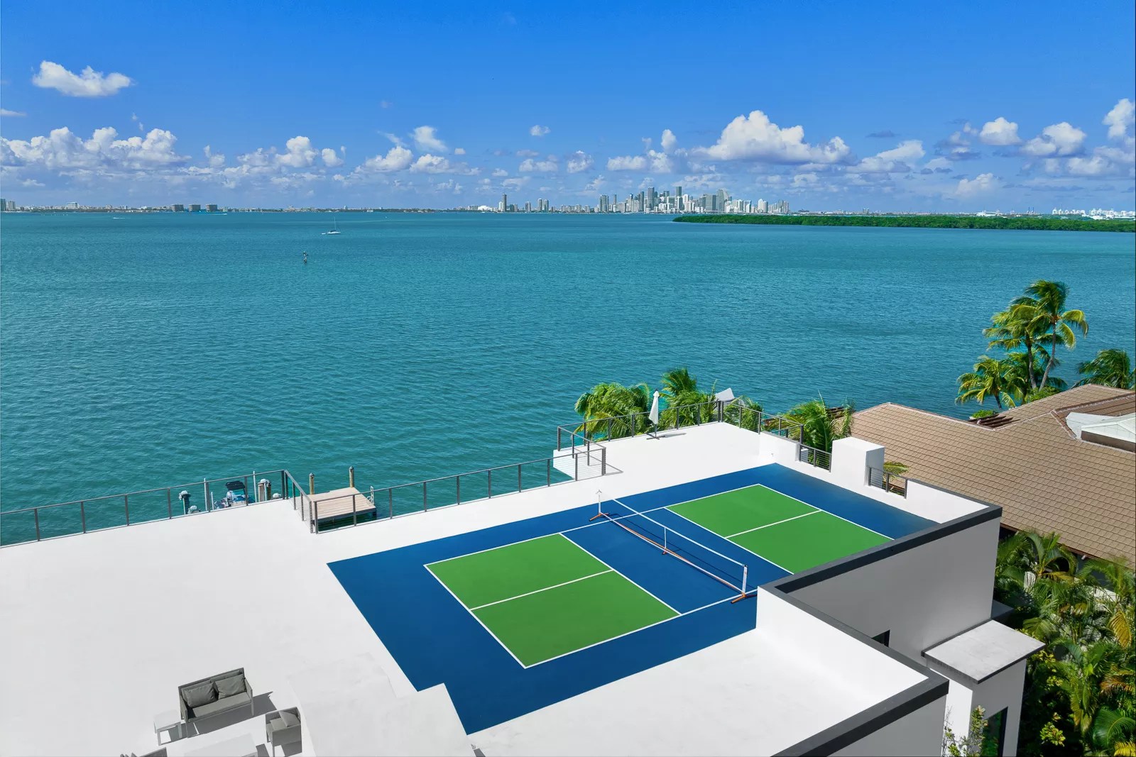 But we haven’t even gotten to the best part of the home: The outdoor area offers a double-level pool, a private dock, and a rooftop pickleball court.