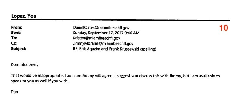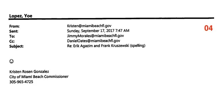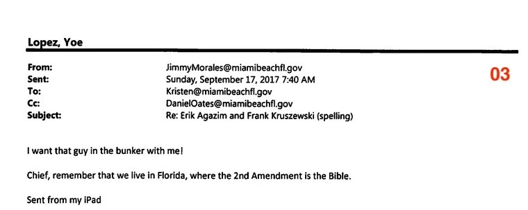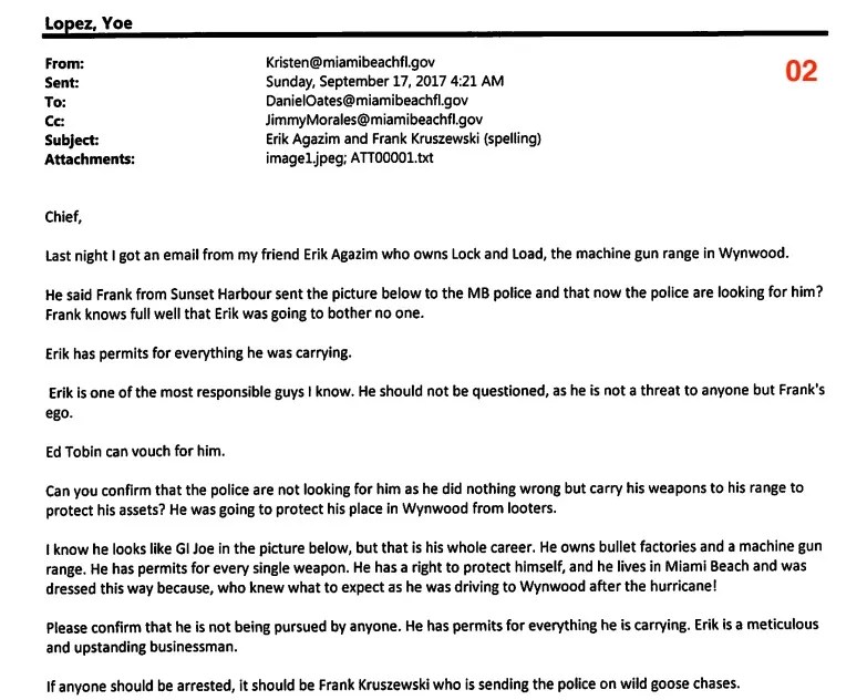 Rosen Gonzalez was quickly spurred into action by the text from Agazim, who owns both an arms-supply business – the National Police Equipment Exchange – which sells guns to local police departments such as Miami Beach PD, and the Lock & Load shooting range in Wynwood. Using her city email address, she demanded that police stop investigating Agazim.
