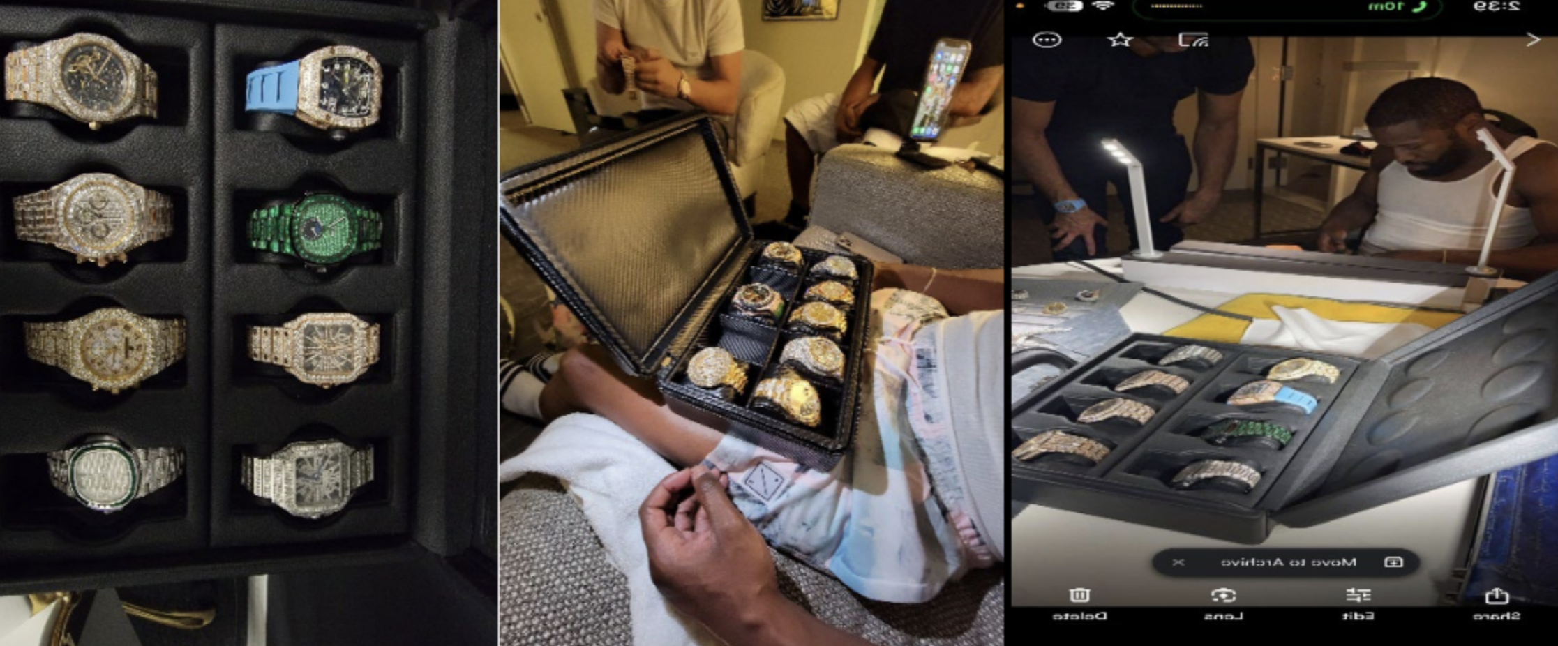 Through a series of meetings with Mayweather and members of TMT at the Fontainebleau Miami Beach in late June 2021, Sulaymanov, who owns Lenzo & Co., claims he sold the boxer a yellow-gold Audemars Piguet watch, two Richard Mille watches, a Patek Philippe watch, a rose-gold Rolex Presidential Day-Date, a diamond ring, and a diamond necklace.
