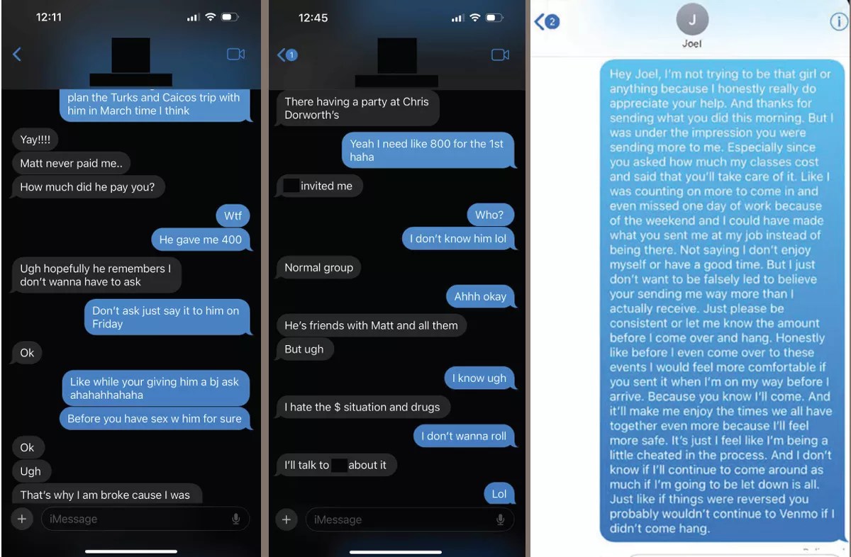 “Matt never paid me. How much did he pay you?” one woman appeared to text another. The recipient advised to ask for payment “while your giving him a bj. Before you have sex with him for sure.”