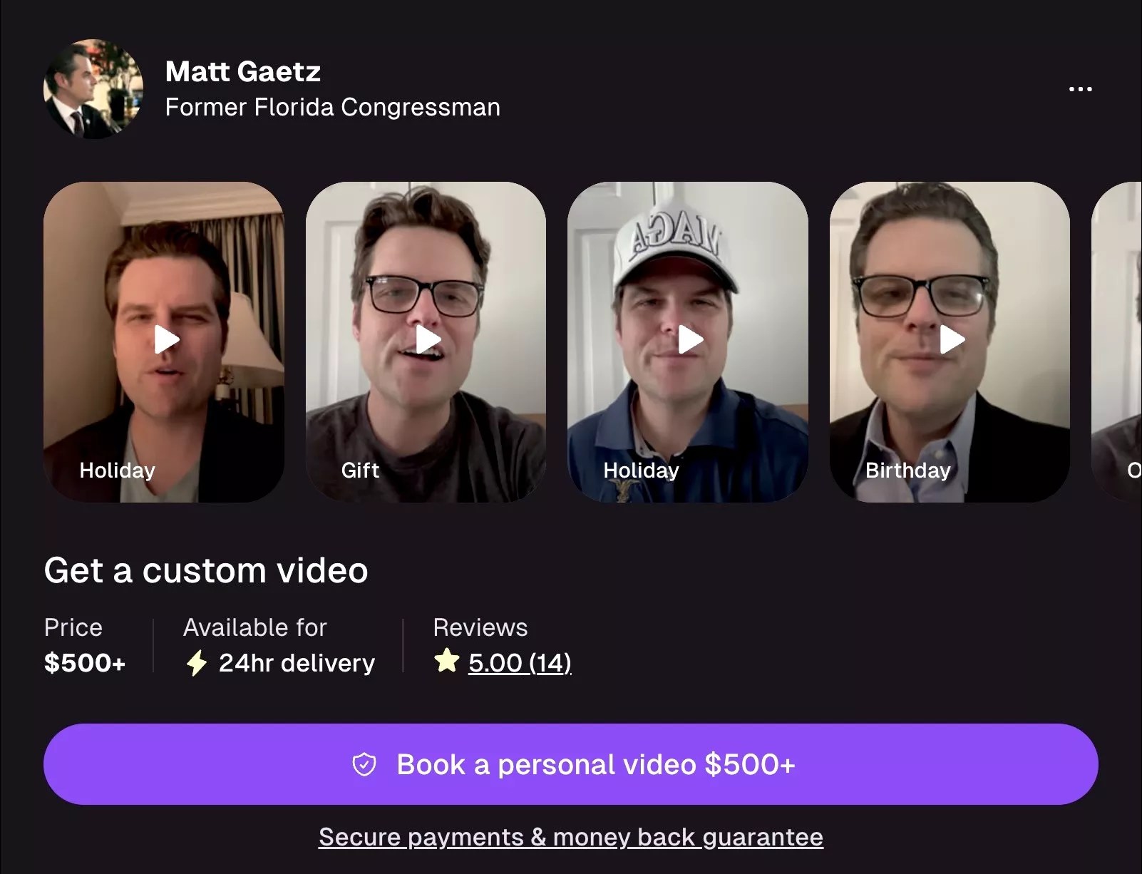 Yes, friends, newly minted ex-U.S. Rep. Matt Gaetz has joined Cameo, where he is now shilling personalized video messages to stans willing to pay considerable sums of money for them.
