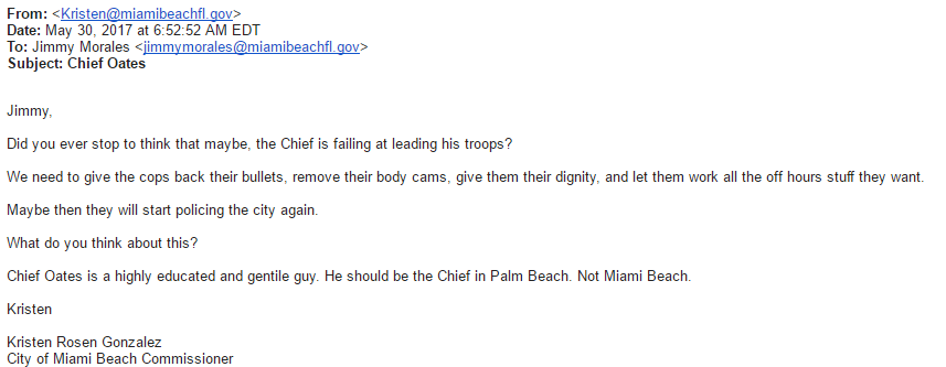 She also bit into Miami Beach Police Chief Dan Oates, and claimed he’s “failing at leading his troops” and said he would be better suited running the Palm Beach Police Department, rather than Miami Beach.