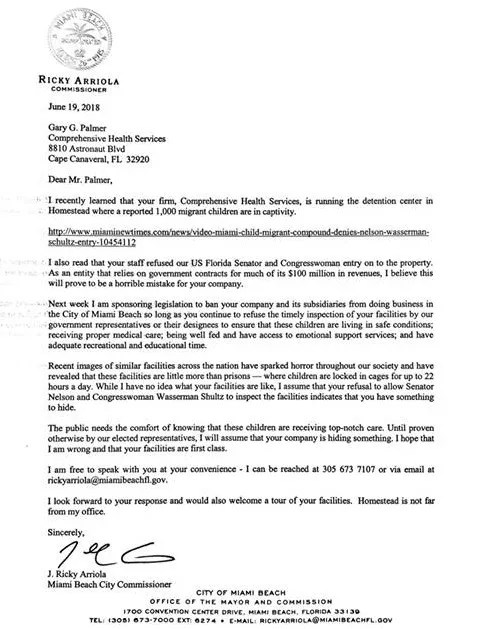 Running a detention camp for migrant children taken from their parents is not great for PR. Two days after New Times broke news that the Trump administration had quietly sent more than 1,000 migrant children to a guarded compound in Homestead, Miami Beach Commissioner Ricky Arriola is threatening to ban one of the contractors running the facility, Comprehensive Health Services, from doing business in his city.