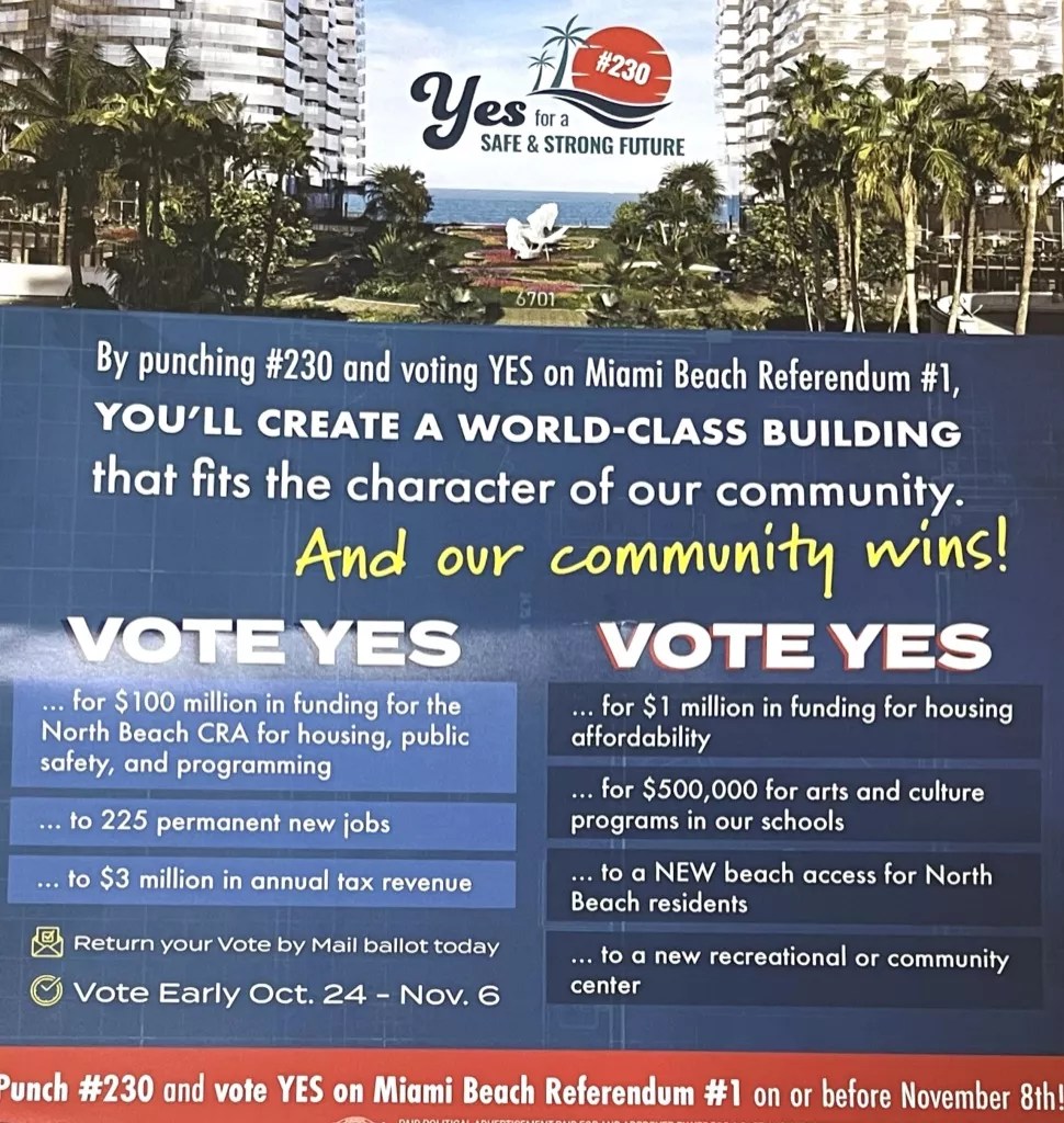 Yes for a Safe and Secure Future, a political action committee, has delivered a deluge of flyers to the mailboxes of Miami Beach residents encouraging them to vote yes on Referendum No. 1.