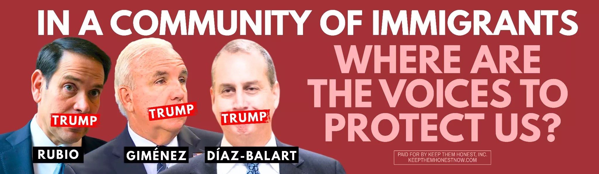 A second sign calls out Díaz-Balart, Giménez, and Secretary of State Marco Rubio. “In a community of immigrants,” it reads, “where are the voices to protect us?” Over their mouths, the word “Trump” is plastered – a visual gag meant to suggest their silence. Díaz-Balart and Rubio are sons of Cuban immigrants, while Giménez was born in Cuba.