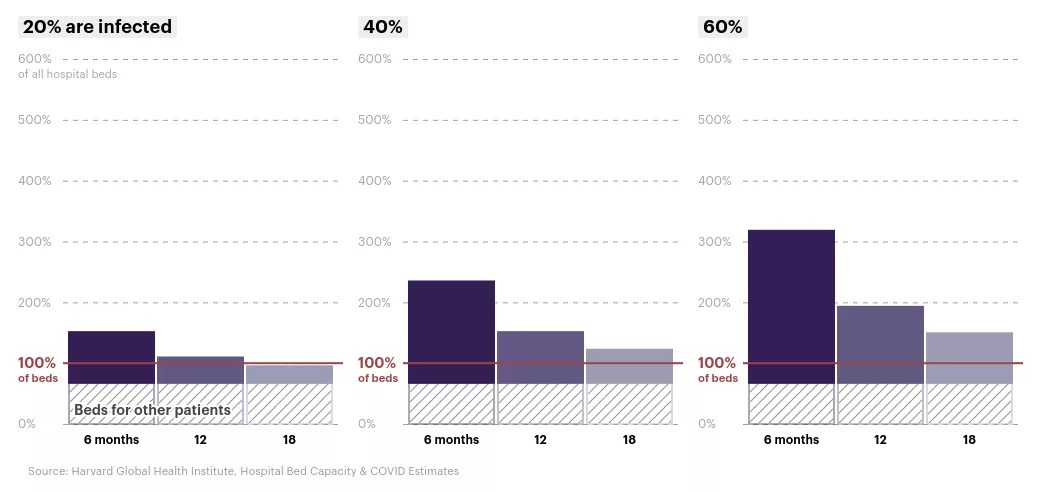 “If we don’t make substantial changes, both in spreading the disease over time and expanding capacity, we’re going to run out of hospital beds. And in that instance, we will not be able to take care of critically ill people, and people will die,” Dr. Ashish Jha told the New York Times in an interview. (Jha is the director of the Harvard Global Health Institute, which produced the estimates that ProPublica compiled.)