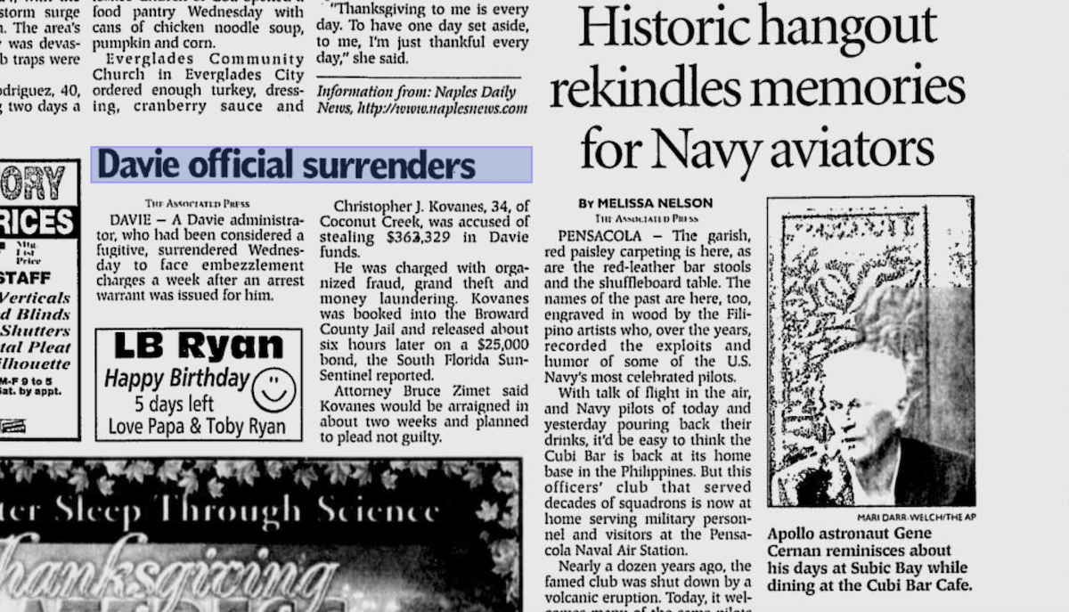 “These lapses in the processes allowed Mr. Kovanes, who is still serving his sentence for abusing his public office, to be in a position of financial responsibility acquiring goods and services,” the OIG wrote, referring to Kovanes’ active 10-year probation. In November 2005, the Associated Press reported that Christopher Kovanes had surrendered to authorities to face embezzlement charges. Screenshot via Ocala Star-Banner archives
