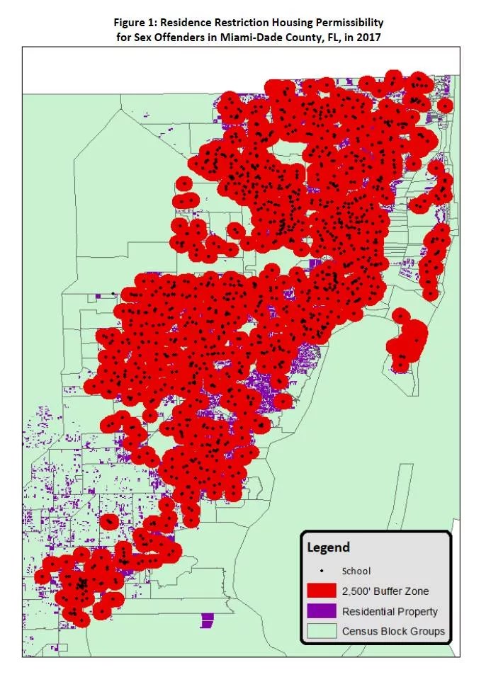 As many as 300 sex offenders have a registered address at or near the encampment, according to state records. Under a 2005 county law ordinance named for Lauren Book, a Florida senator and survivor of child sex abuse, offenders who abused victims under the age of 16 must live 2,500 feet from any school, much farther than the 1,000 feet required under state law.