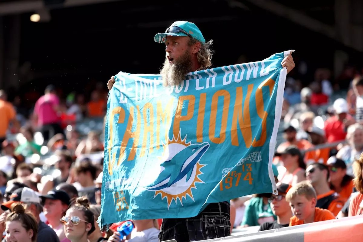 A Miami Dolphins fan cheers during a game against the Cincinnati Bengals at Paul Brown Stadium in Ohio.