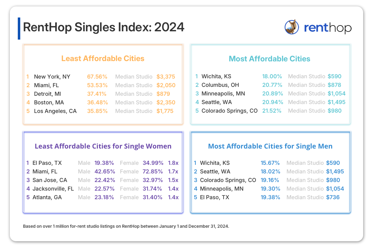 The singles index, which RentHop updates annually, uses the portion of a single renter’s monthly income that must be allocated toward renting a studio apartment to determine the financial strain of housing.
