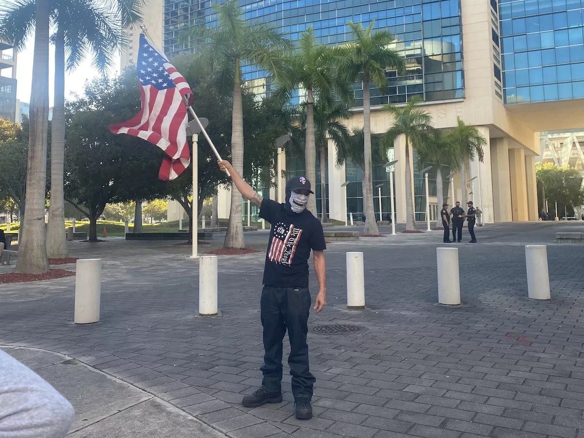 For the most part, the insurrection sympathizers do not want to be interviewed and stand in an intimidating silence, wearing sunglasses and gaiters that cover half their face. They do want to wave the American flag. They disagree that January 6 was “violent,” or that it was an “insurrection” at all, and thus take offense at being called “insurrection sympathizers.” Their shirts carry messages such as “We the People,” “That Which Doesn’t Kill Me Better Start Running,” and “Stop Hating.” Cars passing on North Miami Avenue honk and shout – though it’s unclear if the noises are in solidarity or opposition.