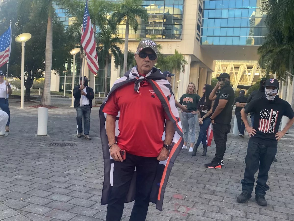 There’s certainly an irony to a group of people wary of the media calling a “press conference.” The portable, pressed-wood podium is the de facto front line between the journalists and the MAGA supporters, Proud Boys, and Miami Springs Republican Club members who requested our presence. Neither faction attempts to cross this invisible line.