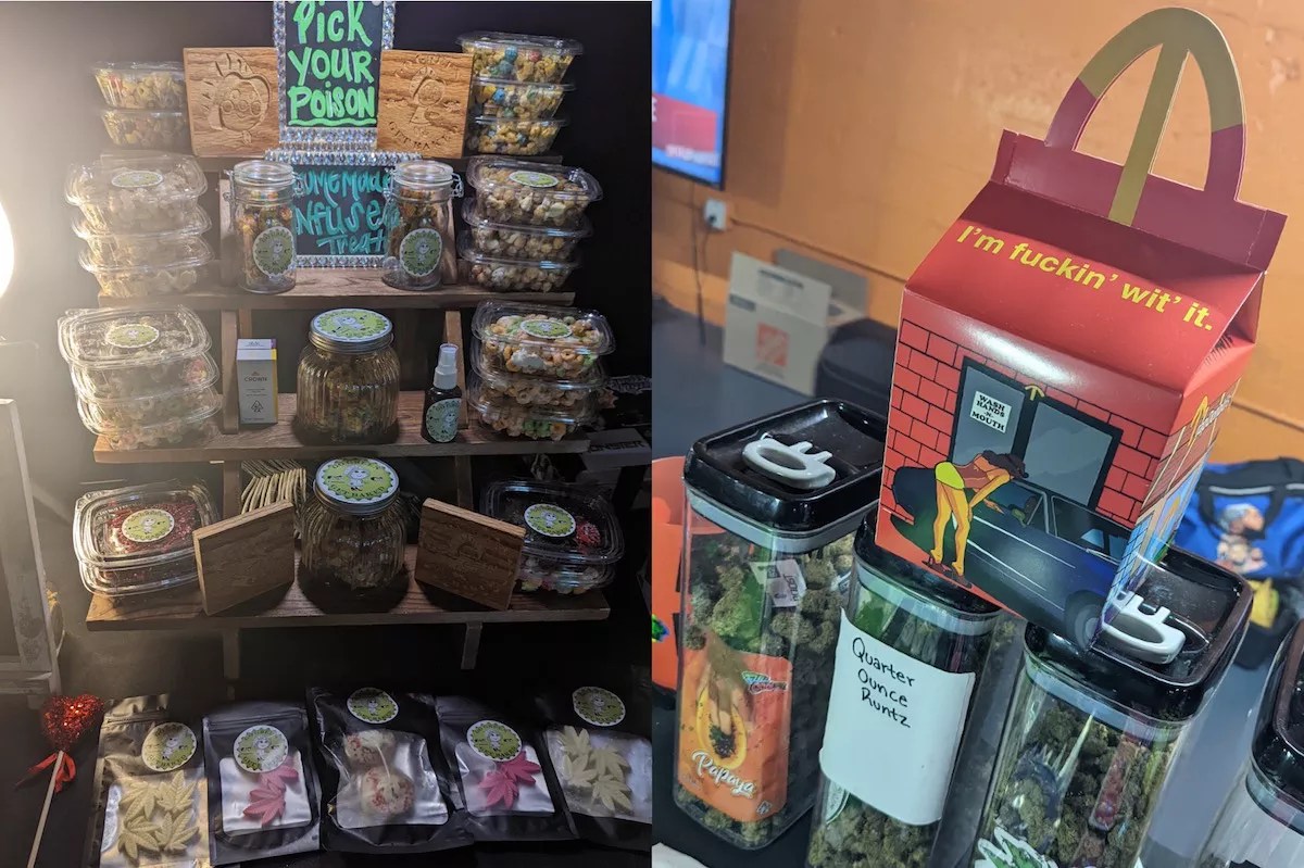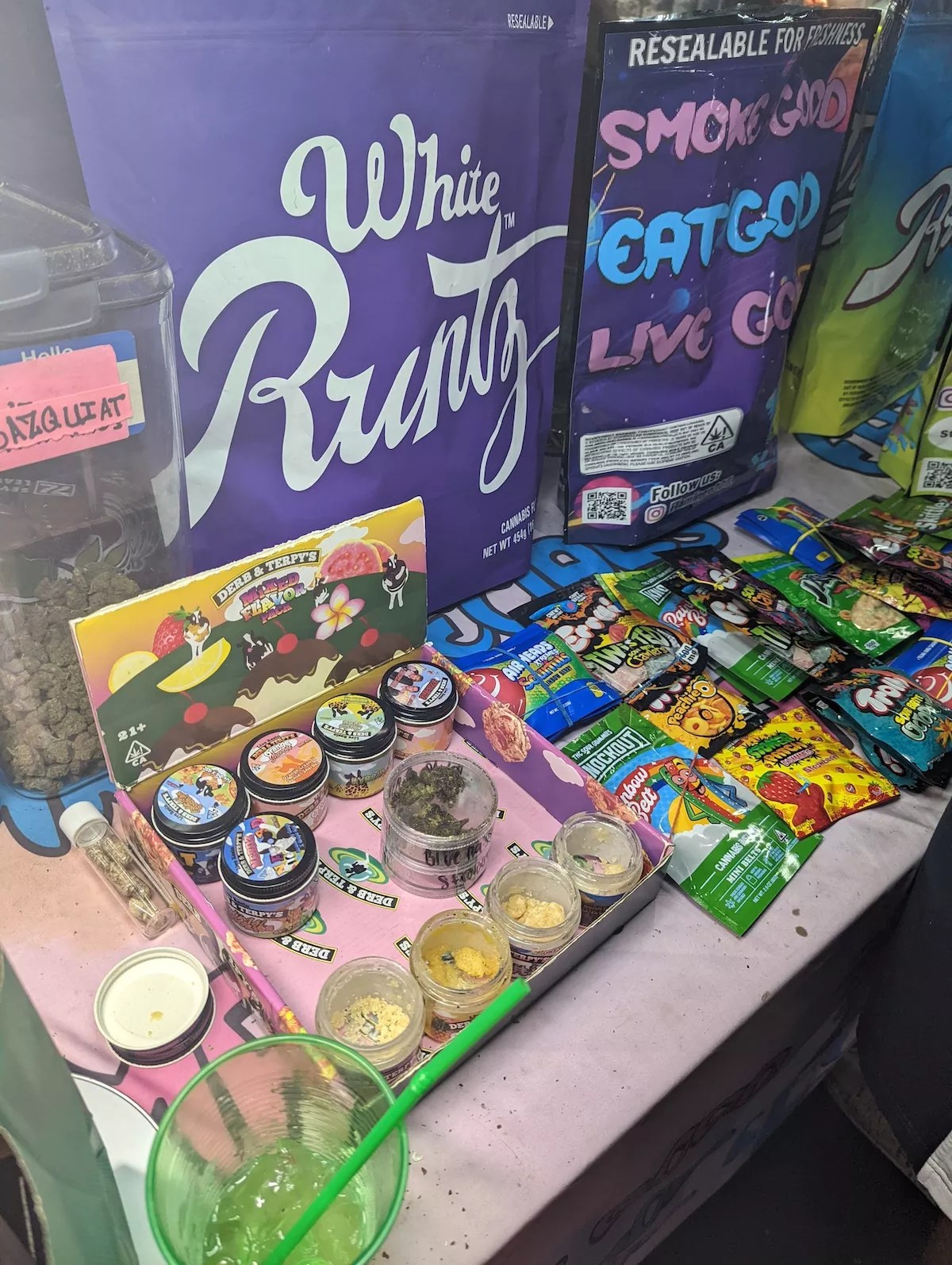 Inside, vendors man rows of tables brimming with an extensive variety of dank buds, prerolled joints and blunts, cannabis concentrates, and weed edibles. Prices ranged from $25 to $50 for 3.5 grams of flower to $200 to $250 for full ounces. Some vendors offered magic mushrooms and mushroom edibles, too. Most accepted Zelle, Venmo, and Cashapp in addition to cash.