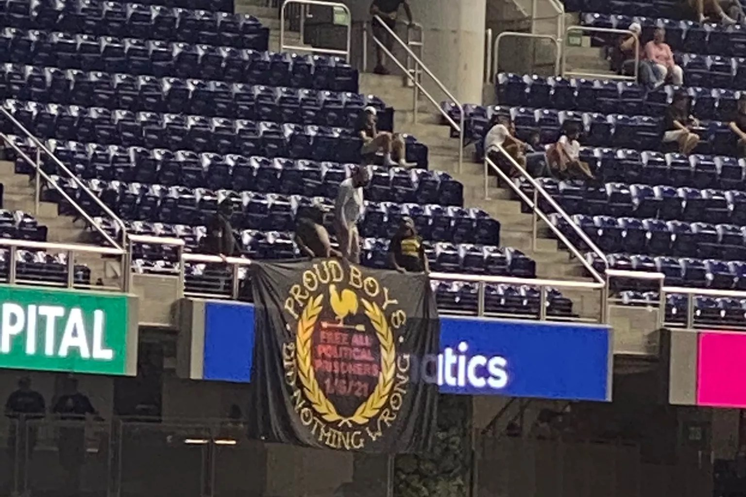 Last night, a handful of attendees at the Miami Marlins game were that guy. While the rest of the fans presumably just showed up to enjoy a nice summer-evening game against the Colorado Rockies, five jackwads at LoanDepot Park decided it would be fun and interesting to unfurl two right-wing posters: one declaring “PROUD BOYS DID NOTHING WRONG, FREE ALL POLITICAL PRISONERS 1/6/21” and the other insisting “TRUMP WON, TAKE BACK AMERICA.”