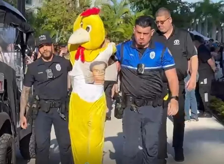 Morgan Gianola, a postdoctoral researcher at the University of Miami, was arrested on February 11 after Miami police claimed he and his fellow protesters in chicken outfits made clucking noises and “caused a disturbance at the event.” Officers booked him on counts of resisting arrest without violence, trespassing, and disorderly conduct.
