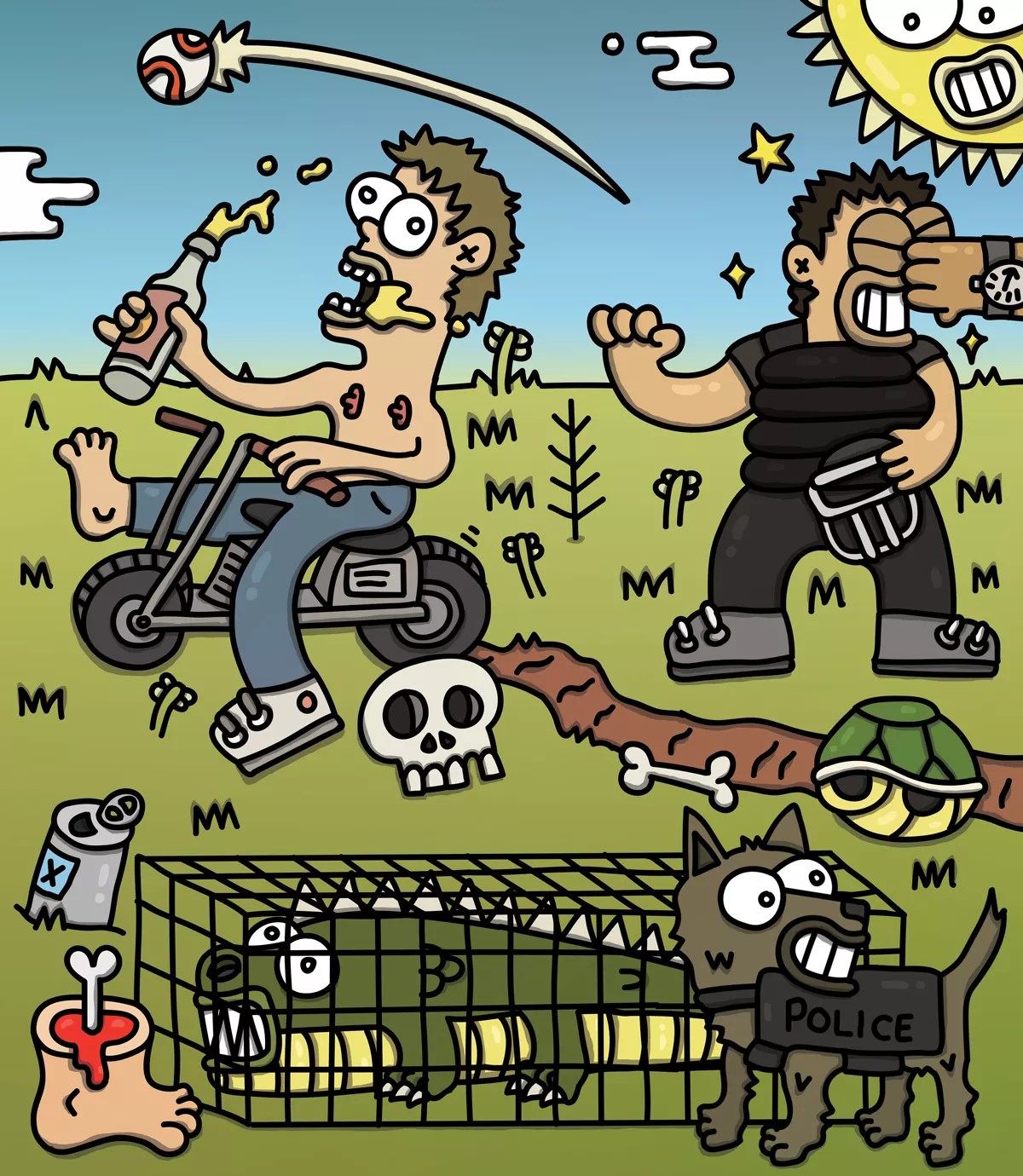 Luis Rosales, age 20, was huffing a can of compressed gas duster while sitting at a bus stop at SW Fourth Street and SW Second Avenue in Homestead at 8 a.m. on a Sunday in early June 2016. He didn’t notice the police officer standing right behind him. When the cop approached, Rosales blurted out he was addicted to huffing gas. “The can of duster is intended to be used to clean electronics and other household items,” the cop advised in the arrest report. “The warning label specifically states that it can be fatal if inhaled or ingested.” Prosecutors dropped the charges. But huffing has been a problem pervasive enough in Florida that 52-year-old Jeffrey McElyea of Orlando was arrested three times in one week in 2015 for inhaling air duster while driving. Elsewhere in the state, 29-year-old Bryan Bennett from Ocala literally passed out while standing in line at a Walmart after huffing duster. He was arrested in early December 2012 and charged with inhaling a chemical substance – the same charge he caught from Ocala cops just two weeks earlier. Illustration by Craig Winzer