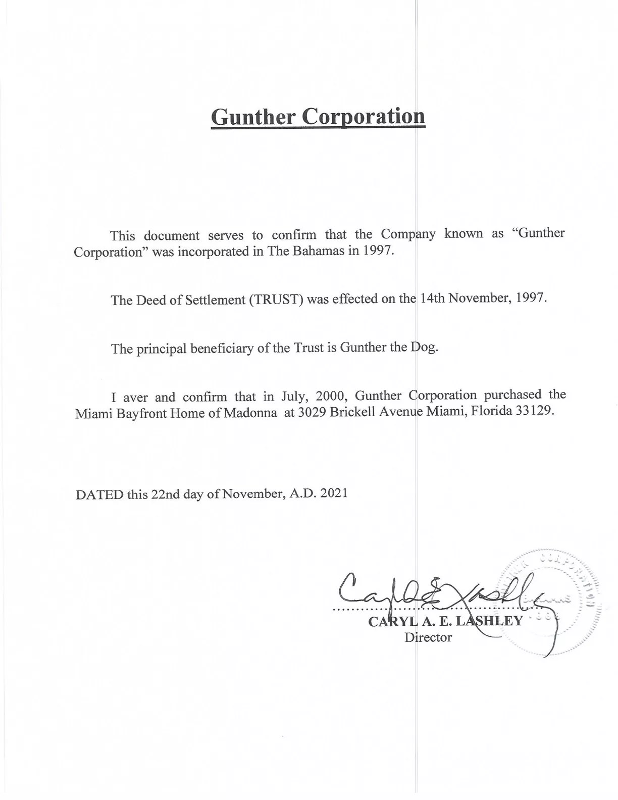 But Assouline publicist Gaby Harris presented New Times with a document signed by Caryl Lashley, an attorney representing the Gunther Corporation, declaring that “Gunther the Dog” is the beneficiary of the trust and therefore owns the property. The one-page document is signed by Lashley and dated Monday. It’s embossed with a seal that says “Gunther Corporation.”