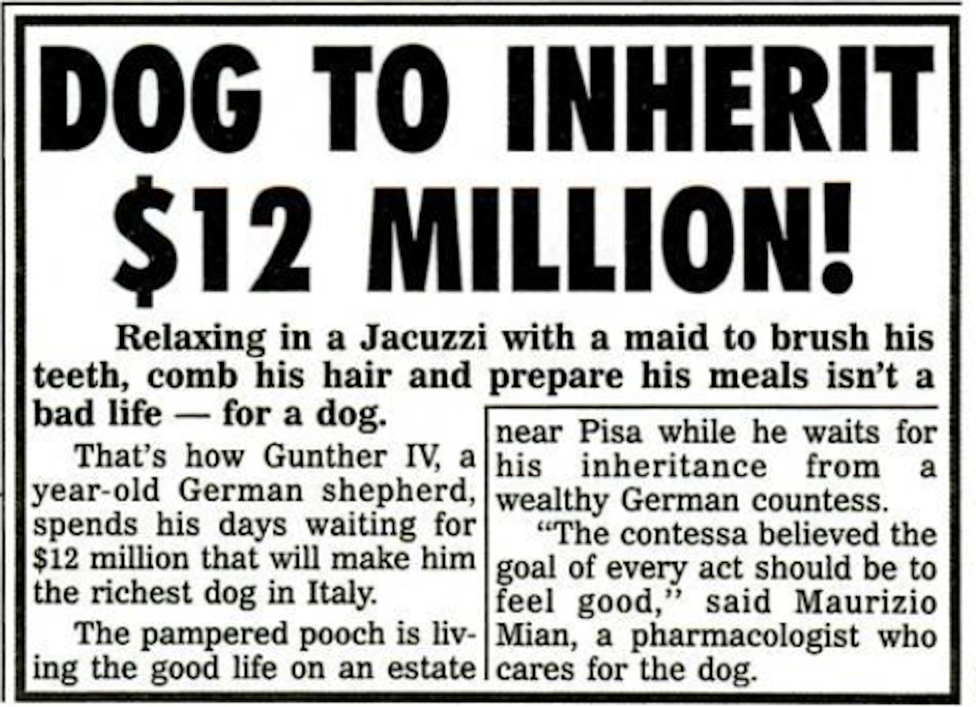An April 12, 1994, edition of the tabloid Weekly World News – notorious for its freakish and mostly fictional stories – includes an article about Gunther IV, titled “DOG TO INHERIT $12 MILLION!”
