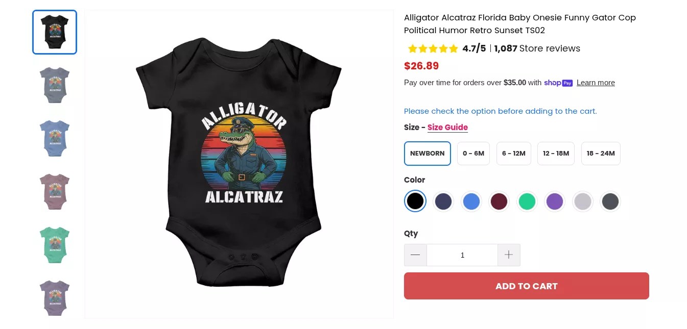 Don’t worry, we didn’t forget about the little fellas. An “Alligator Alcatraz” onesie is the perfect baby gift.