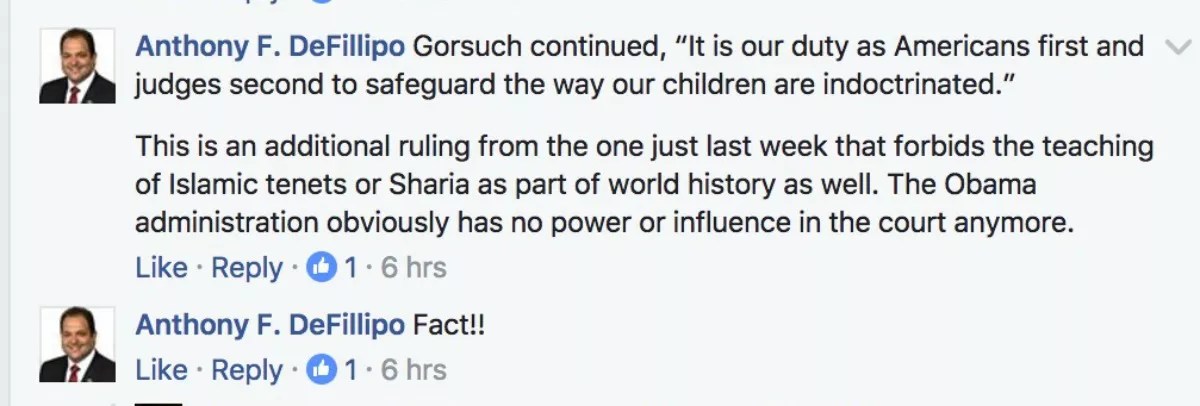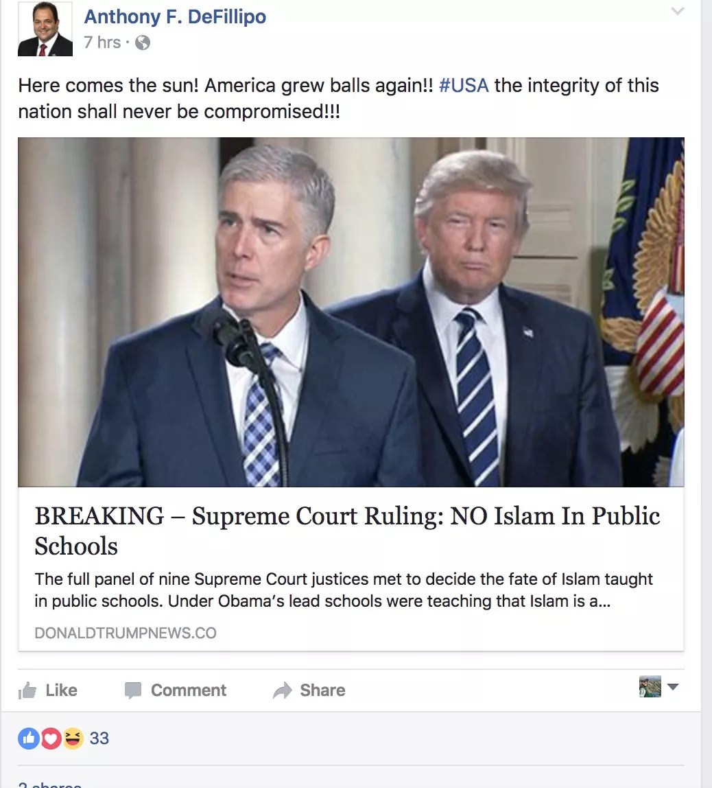 That DeFillipo could be bamboozled by patently fake news is alarming; more concerning is his apparent delight over a story that paints Islam as violent and contrary to American values and trumpets Judaism and Christianity as the only legitimate religions in the United States.