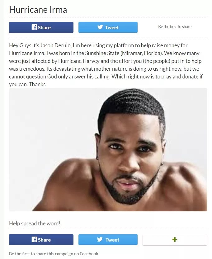 “Hey Guys it’s Jason Derulo, I’m here using my platform to help raise money for Hurricane Irma,” the page says. “