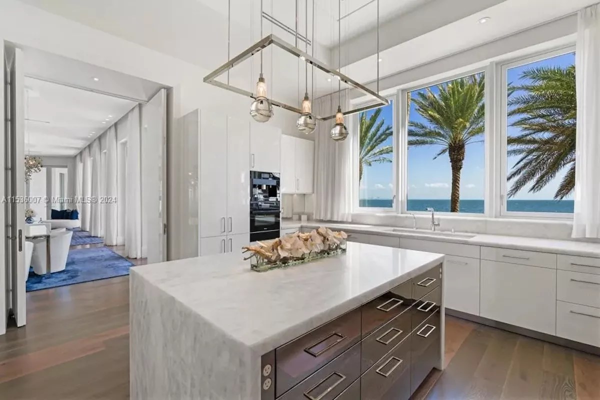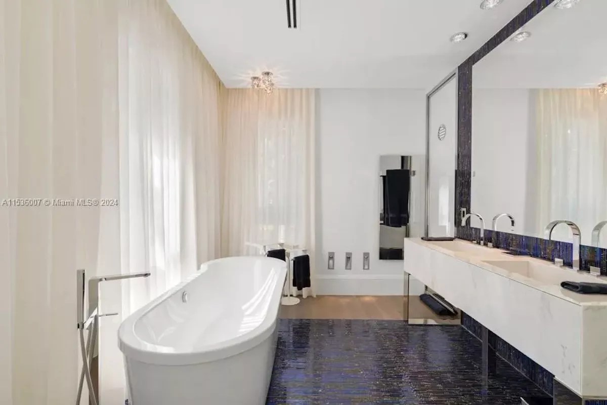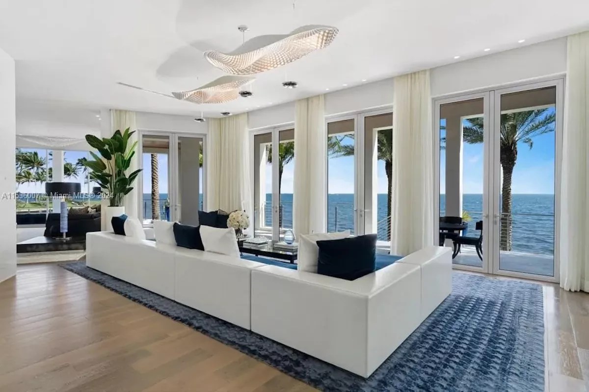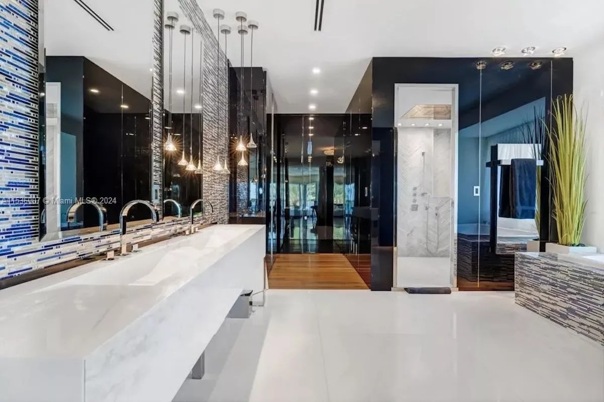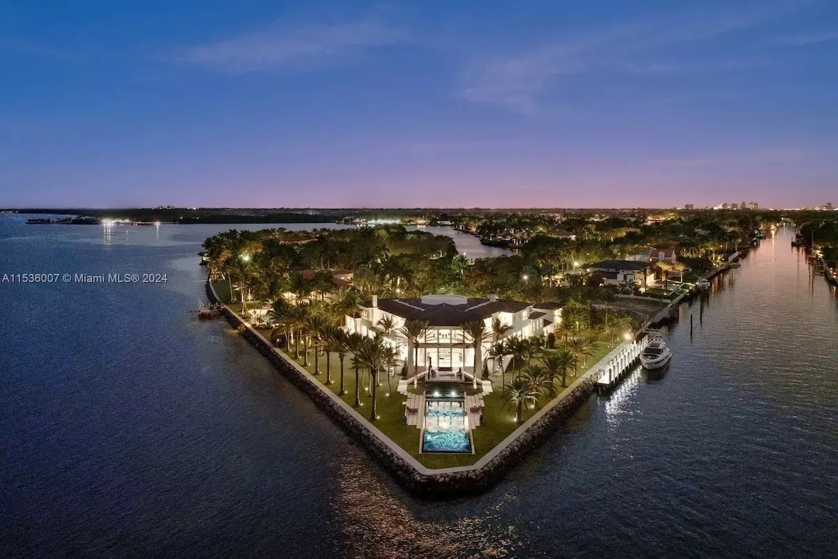 Listed in February for a whopping $57 million, the sprawling waterfront mansion sits on a V-shaped lot tucked away in the exclusive Gables Estates community and is designed by Miami architect Ramon Pacheco. The 1.2 acre, palm-tree lined property boasts eight bedrooms, 12 bathrooms, and features a spa, five-car garage, and a one-of-a-kind mosaic infinity pool overlooking Biscayne Bay.