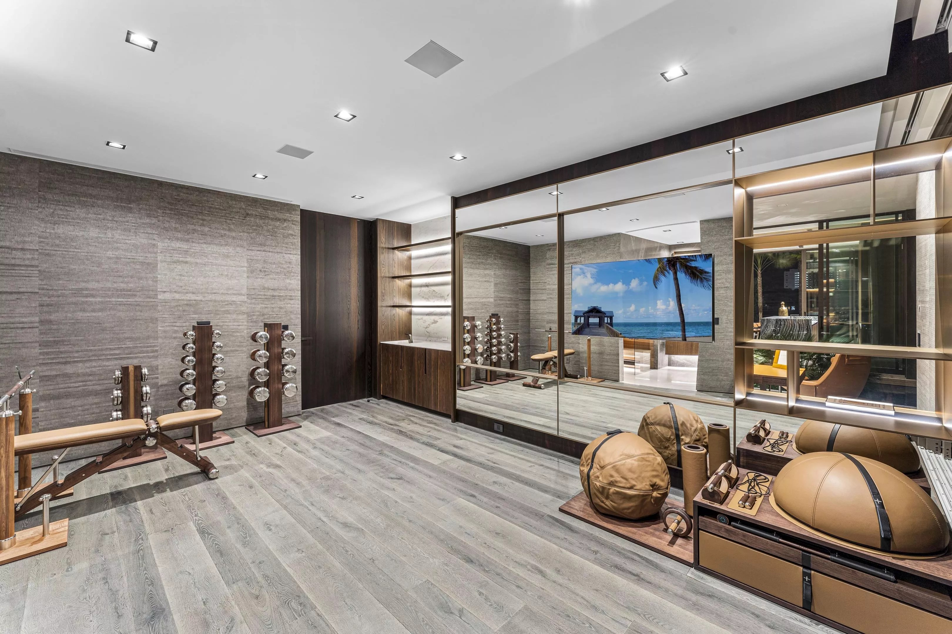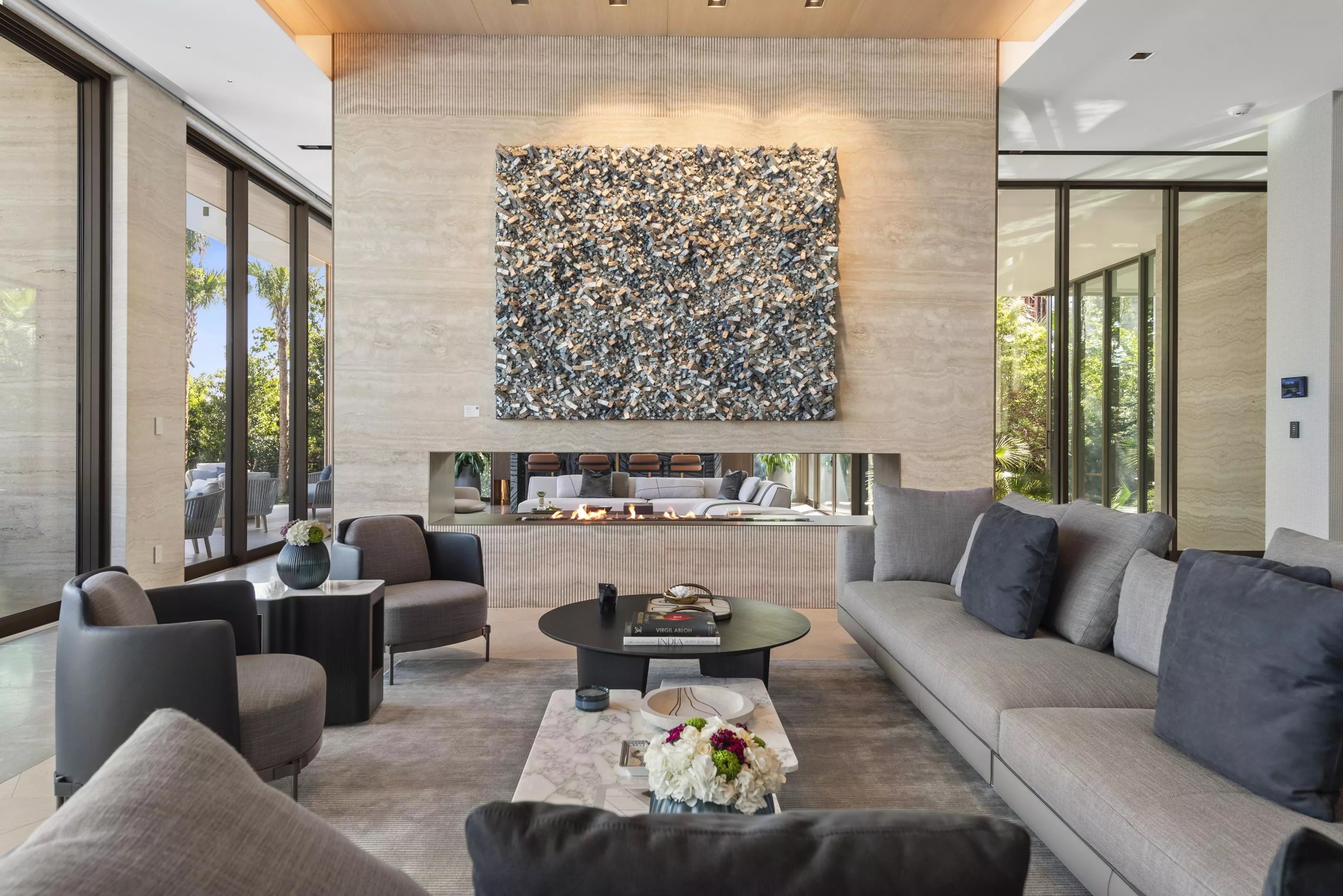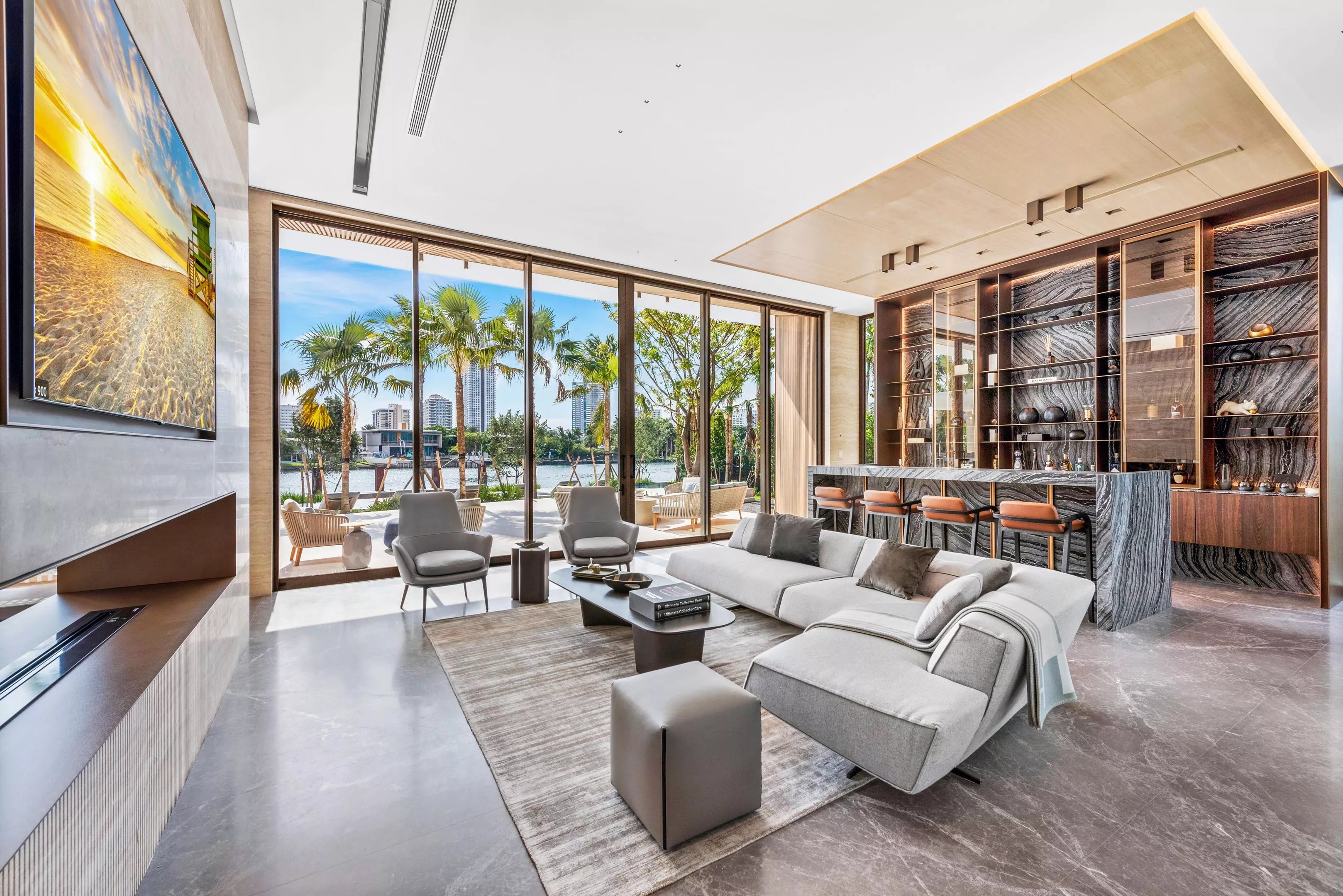 The interior finishes include marble, leather, and “luxurious” wall coverings handcrafted by Italian artisans, according to the listing. The LEED Gold-Certified home features expansive terraces, a gym and spa, home theater, office with sliding doors that open to the outdoors, chef kitchen, marble wine cellar, outdoor kitchen, and a fire pit. Photo by the Waterfront Team