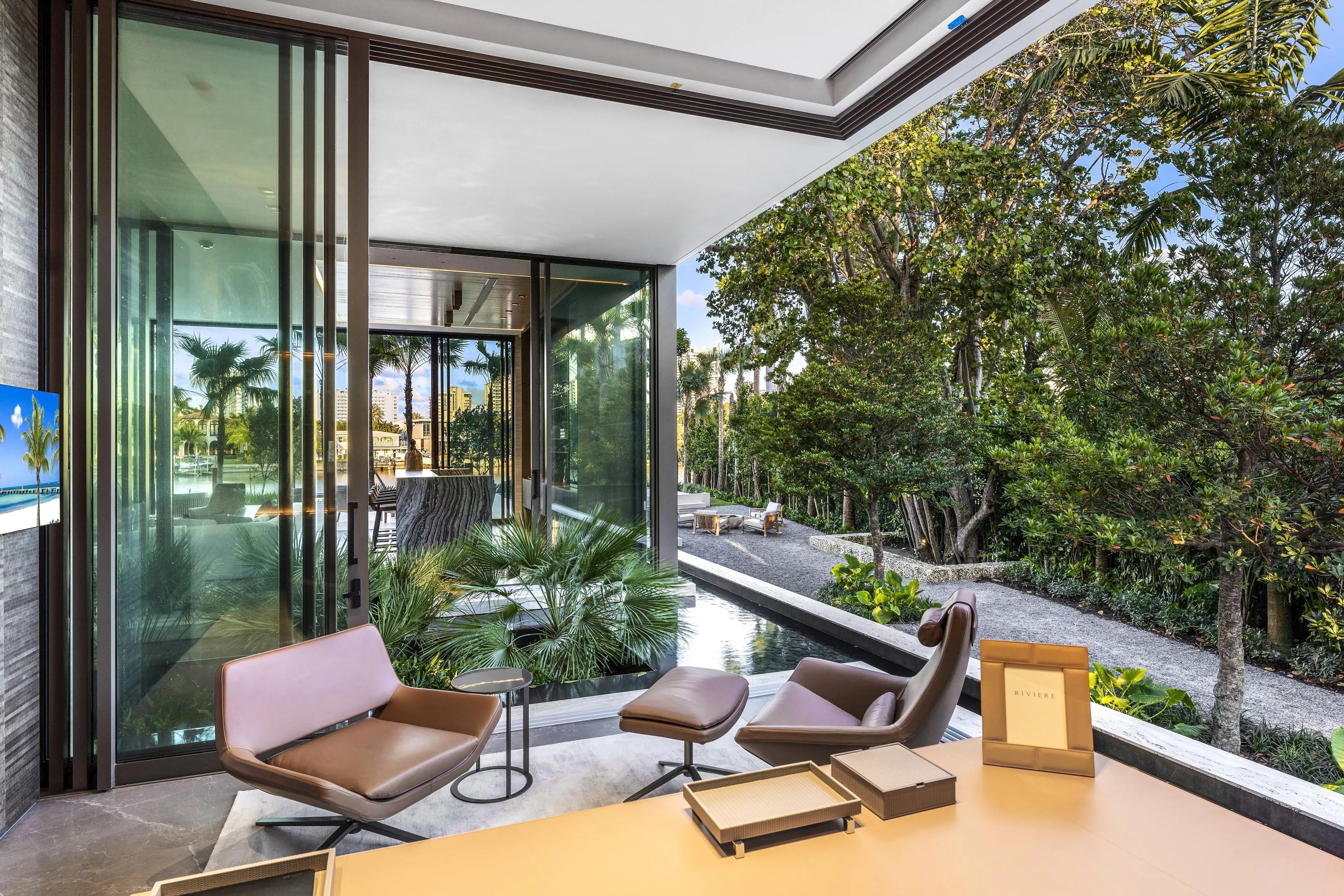 Developed by Philippe Harari’s Aquablue Group, “Villa Arte” at 98 La Gorce Circle sits on a 31,800-square-foot lot and has numerous water elements at the entrance including a waterfall and a moat-like feel by the front door. The entryway is also decorated with bronze book-matched travertine and Japanese white oak – sounds fancy!