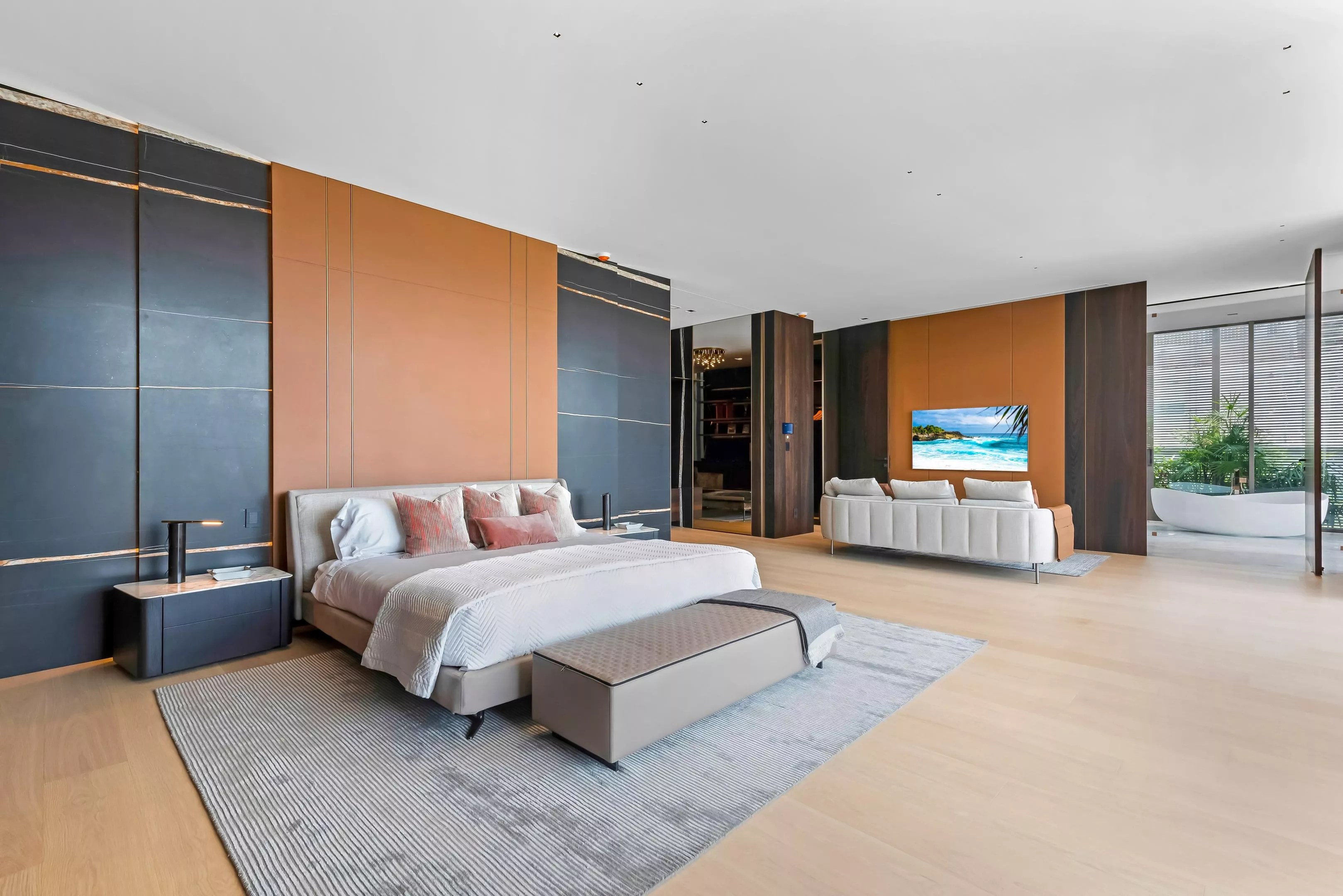 The waterfront property has an 88-foot-long “cascading infinity-edge pool and jacuzzi” and a dock for a large yacht. The master suite is 1,800 square feet and opens to a large rooftop.