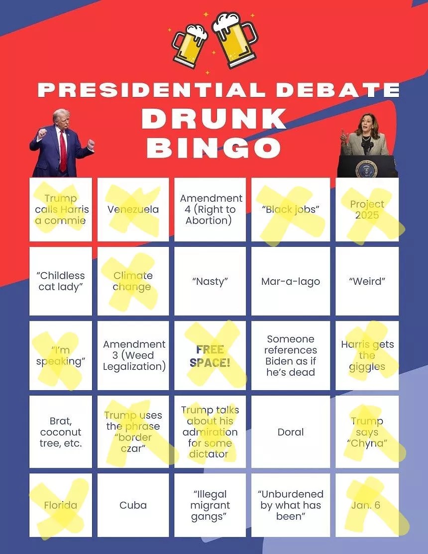 Here, on one of our cards, is every bingo spot we crossed off during last night’s debate between Trump and Vice President Kamala Harris (If we missed any, please let us know!):