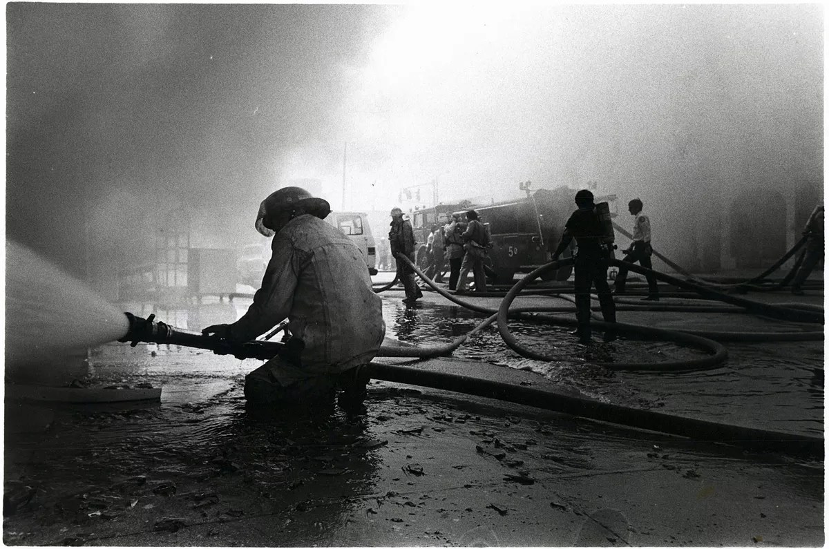 After Hurricane Andrew leveled South Dade in 1992, Cooke captured hundreds of scenes of devastation and emotional rescue work. When 2 Live Crew’s Luther Campbell won his decisive First Amendment judgment in 1994, Cooke captured the rapper’s joyous fist-pump with attorney Bruce Rogow. As hundreds of journalists camped out in Little Havana in 2000 to document the legal tug-of-war over Elián González, Cooke photographed the media madness. He wasn’t above playing paparazzo, either, and over the years snagged unscripted Miami pics of everyone from Arnold Schwarzenegger to Andy Garcia to Gloria Estefan. Firefighters extinguish a warehouse blaze. See more photos from Bill Cooke’s archives. Photo via the Bill Cooke archives