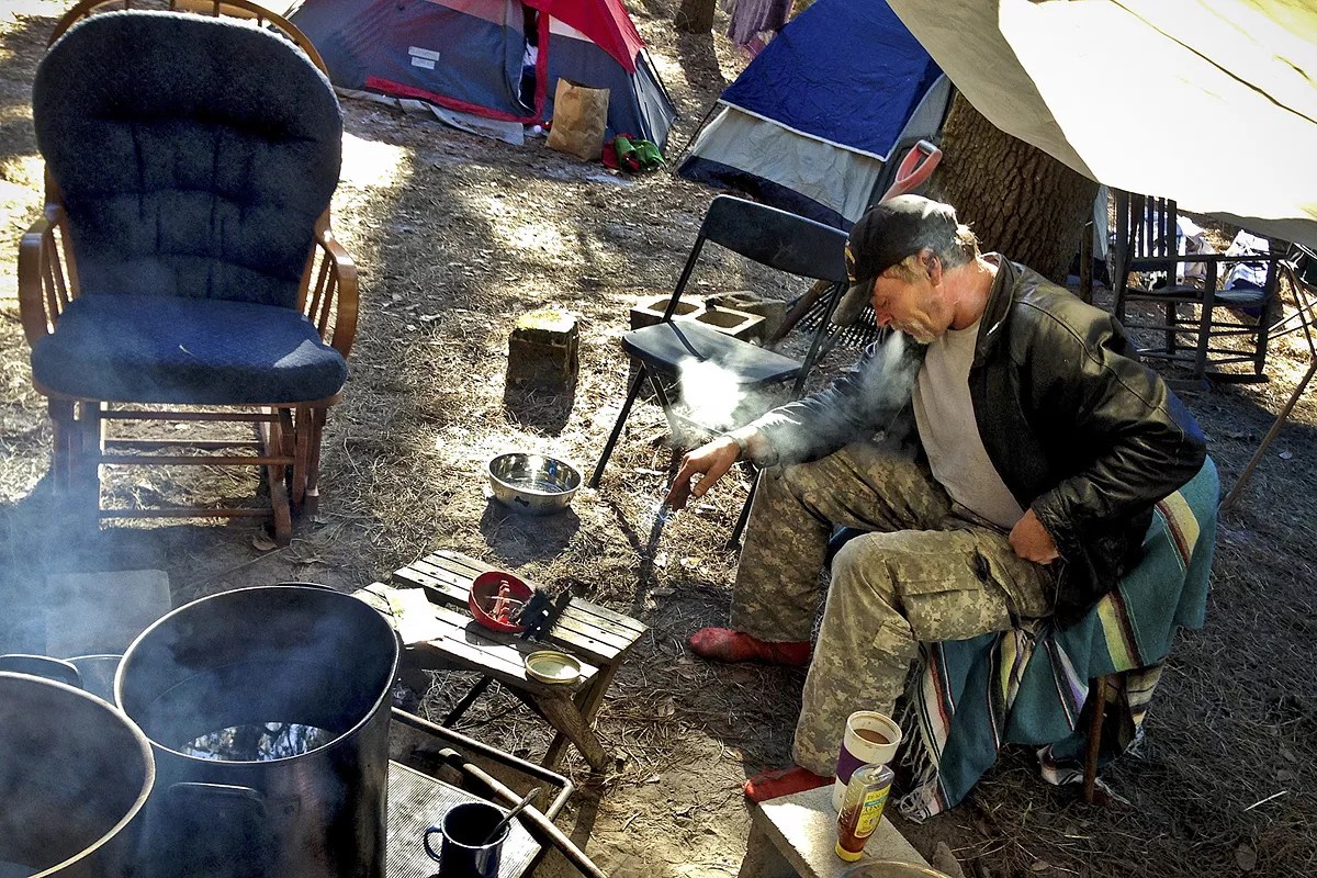 Those congregated this February morning are crunchy but genteel, almost to a fault. Mossing wears a Bob Marley T-shirt and rambles excitedly about the life-changing power of love. An Indiana man who introduces himself as Roaming Wolf believes the camp should incorporate as a religious organization, a church of naturalism for folks eager to live off the land as their ancestors did. Many of them walk around barefoot, including Fallan Fontenot, a 23-year-old South Dakotan who wears her blue and purple hair in braided pigtails and jokes that her preferred mode of transportation is her “Lamborfeeties.”