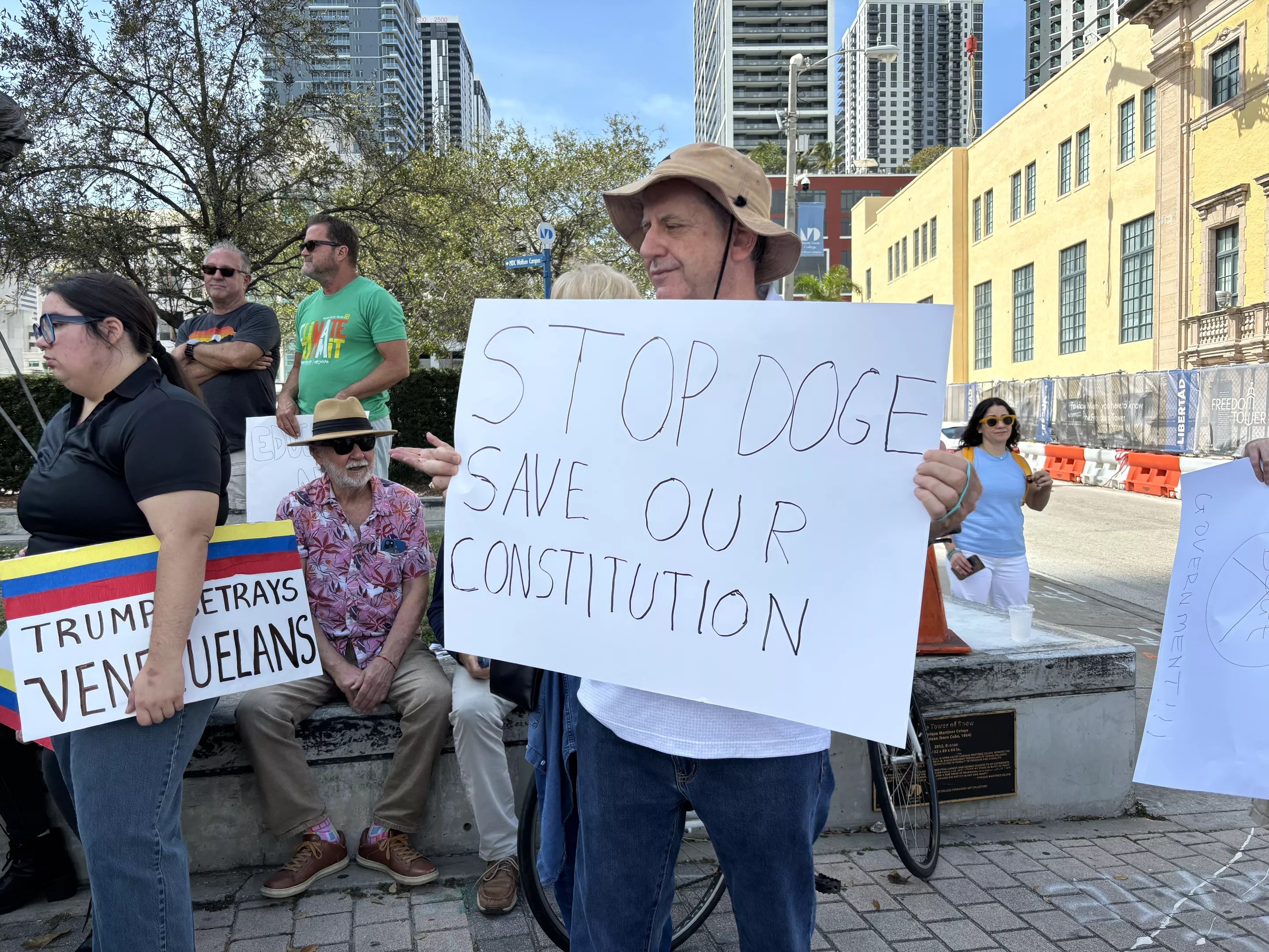A protester holds a sign that reads, “Stop DOGE, Save Our Constitution” at a recent protest against the Trump administration in downtown Miami.