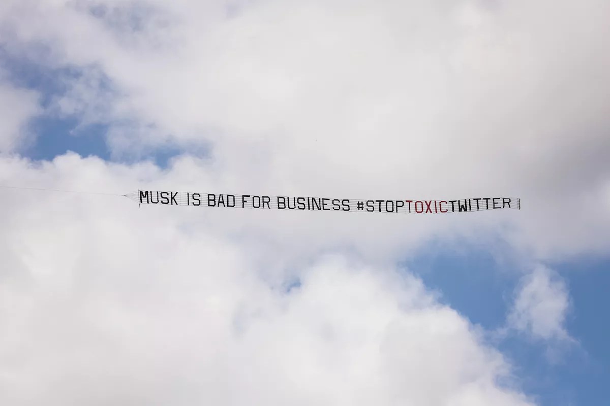 Ahead of Musk’s keynote speech at the POSSIBLE ad convention at the Fontainebleau Miami Beach Hotel, civil-rights activists from the groups Free Press, Media Matters for America, and Accountable Tech have strategically flown banners above the event venue in an attempt to remind advertisers of the fallout from Twitter’s increasing tolerance of hate speech. On Monday, as advertising industry executives gathered in Miami Beach for the three-day event, the groups flew an all-caps banner that read, “Musk Is Bad For Business #StopToxicTwitter.”