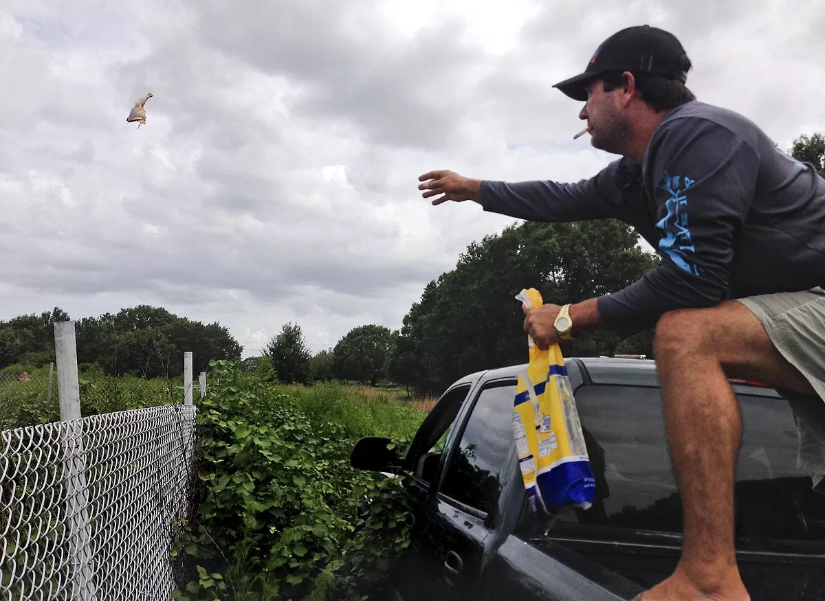 As Nichols tosses thighs and drumsticks over a chainlink fence, the gators quietly emerge from the pond, rippling the water’s surface. They chomp down on the chicken and swallow the bones whole. In the background, birds chirp and a warm breeze blows. It’s a surprisingly serene scene.