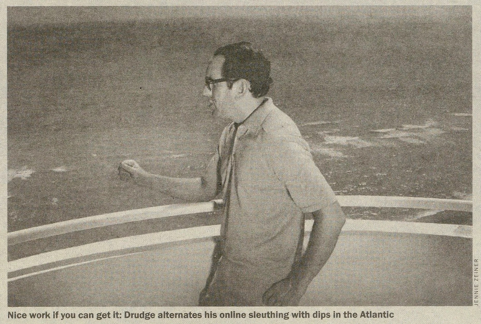 Conway and Coulter had been leaking Jones deposition material about a young White House intern to Newsweek reporter Isikoff, who was hot on the Clinton sex trail. When Newsweek editors decided on a Saturday night to hold the story from that Monday’s issue (they wanted more evidence than third-party telephone conversations), Conway and Coulter turned to Drudge. Several hours later, on Sunday, January 18, 1998, the Drudge Report posted this headline: “NEWSWEEK KILLS STORY ON WHITE HOUSE INTERN. BLOCKBUSTER REPORT: 23-YEAR-OLD FORMER WHITE HOUSE INTERN, SEX RELATIONSHIP WITH PRESIDENT. WORLD EXCLUSIVE. The Drudge Report has learned that reporter Michael Isikoff developed the story of his career, only to have it spiked by top Newsweek suits hours before publication….” Screenshot of a photo of Matt Drudge that appeared in the June 28-July 4, 2001, issue of New Times Miami New Times image (photo by Steve Satterwhite)
