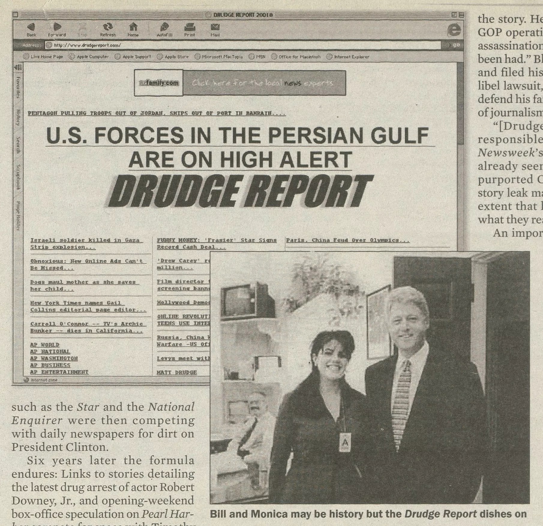 The end result was a starkly designed, link-studded site that mixed Hollywood gossip with Capitol Hill buzz. Considering the tenor of the times, it wasn’t an odd juxtaposition. Supermarket tabloids such as the Star and the National Enquirer were then competing with daily newspapers for dirt on President Clinton.