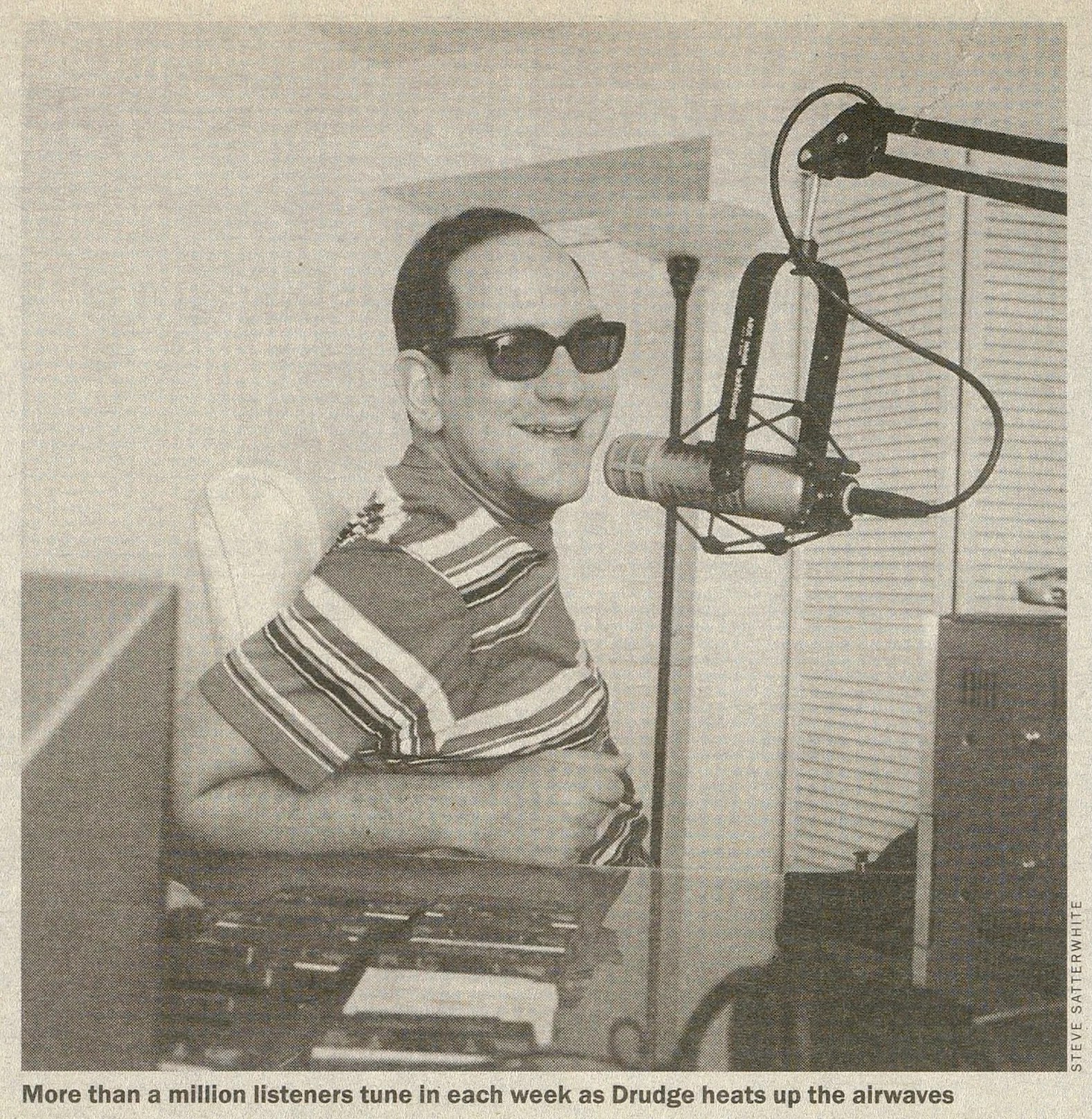 Perhaps that Times blowup and its reminder of his underdog status help Drudge to psych up before turning on his microphone every Sunday evening at 10:00. At that moment – via satellite uplink and an engineer in a New York City station – he begins preaching to his fans on 157 talk-radio stations around the nation. (According to Arbitron, more than 16,000 people tune in to hear him on Miami’s WIOD-AM 610.) Sunday evening has traditionally been considered a graveyard slot by radio executives, and Drudge’s development of a significant audience there hasn’t gone unnoticed or unrewarded; his six-figure radio paycheck provides the bulk of his current income.