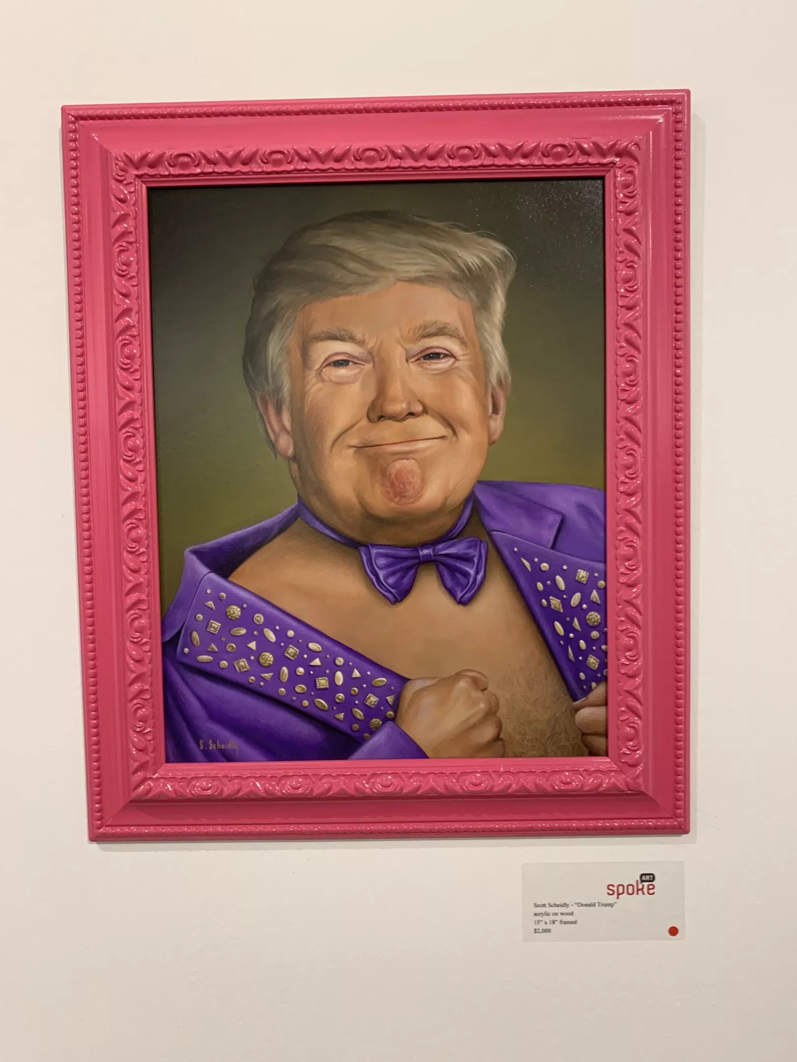 If you thought Art Basel was going to avoid homophobic Trump art, you think far too highly of the art world. These pieces come from Orlando-based painter Scott Scheidly’s Pink series, which began before Trump took office and has long been labeled “offensive” to the LGBTQ community. Scheidly began the series by painting Adolf Hitler in a pink-and-purple ensemble. But lest anyone think this is some brainy comment on the lack of powerful gay male figures on Earth, think again: Scheidly, who is straight, says he created the series because he thinks it’s funny to see leaders in feminine outfits. There’s nothing deeper to it than that. He recently Instagrammed a painting of a femme Fidel Castro with the hashtag “#HePutACigarInMyButt.” Many of his other posts are hashtagged simply “#funny.” He also once painted Barack Obama as a pink pimp, which is both homophobic and racist.